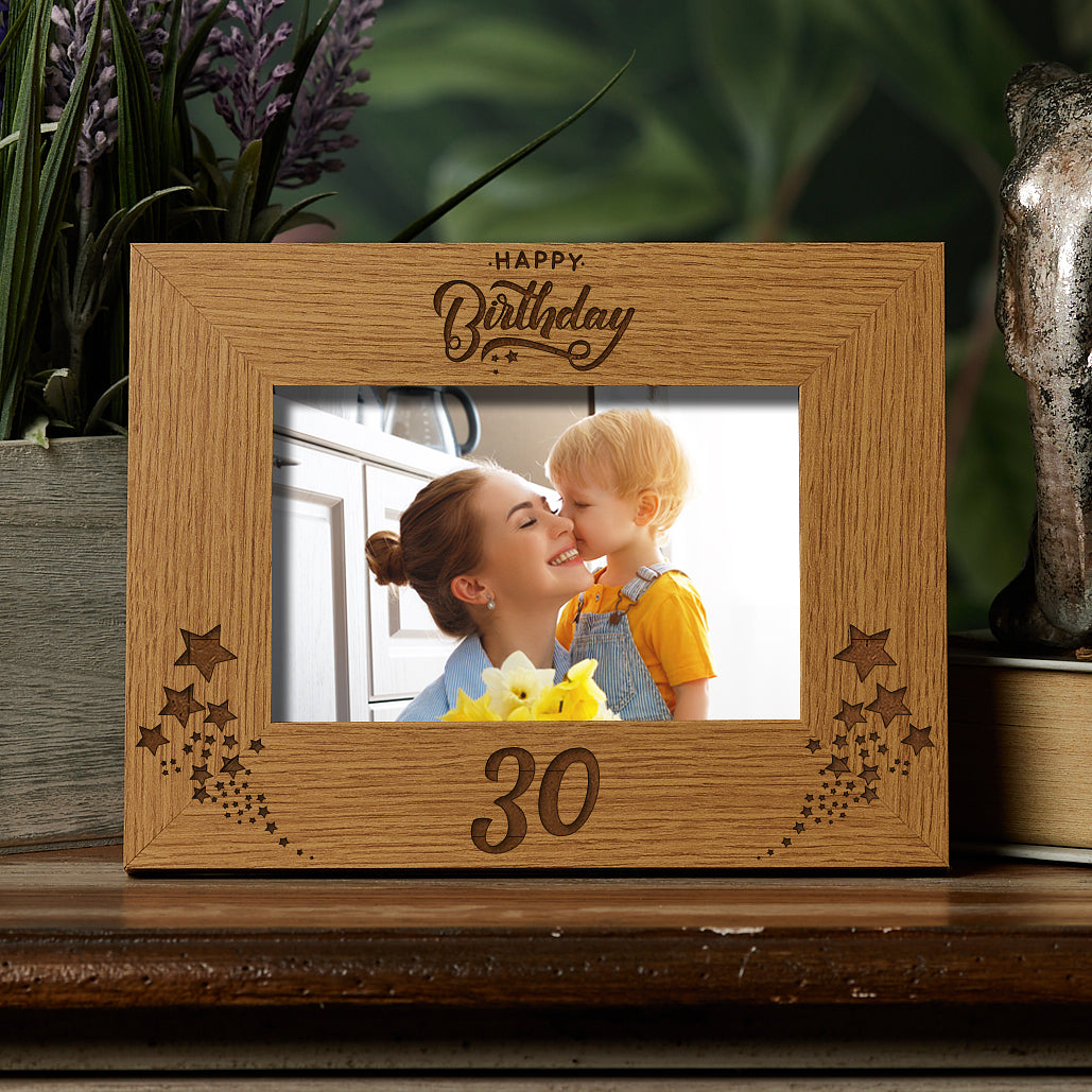 The frame has a oak wood finish with the engraving of "Happy Birthday" on top while underneath you have the number 30. Please select the photo frame size you require, the sizes are for the photo size. There is a stand at the rear so will sit flat on any surface.