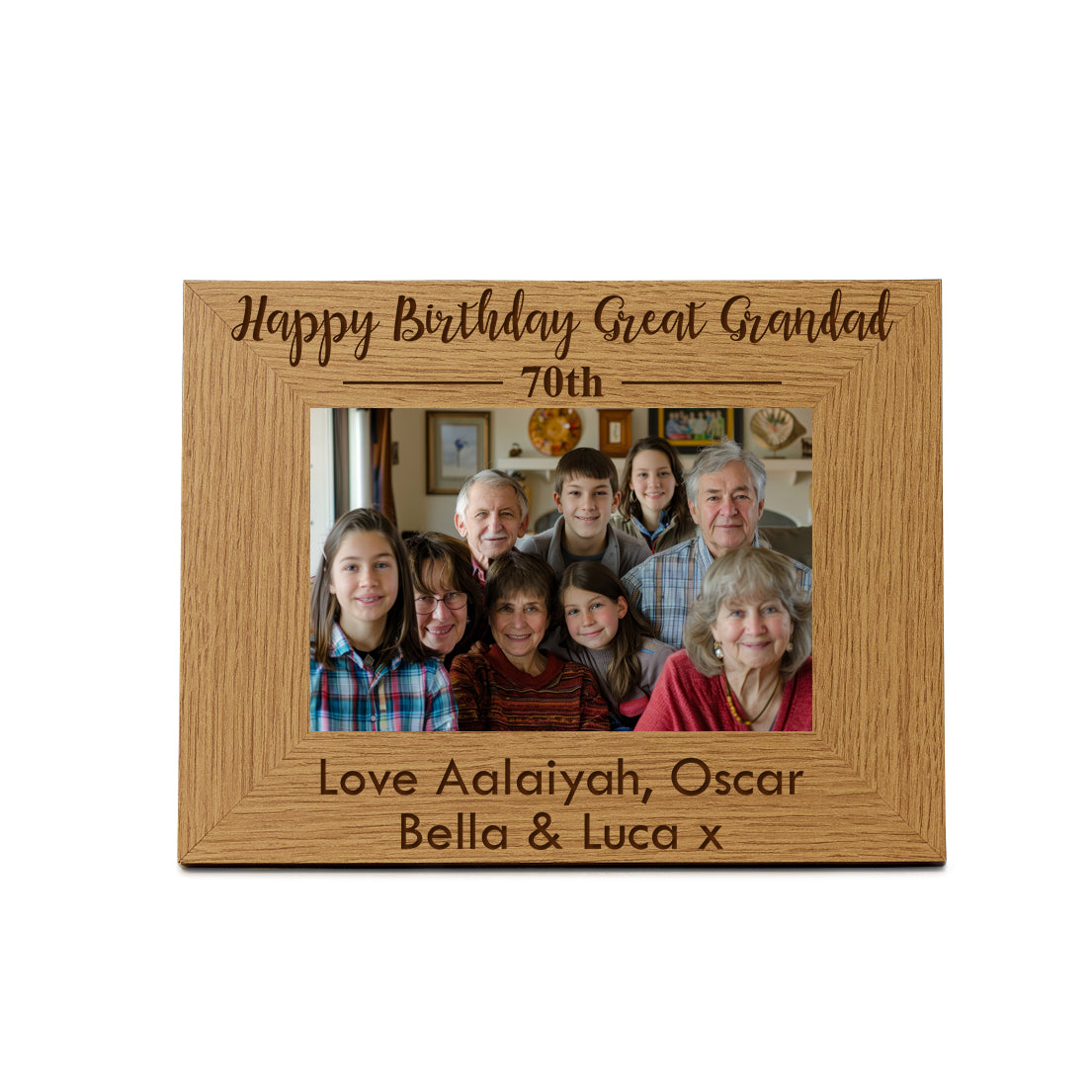 The ukgiftstoreonline Personalised Happy Birthday and Title Any Age Wooden Photo Frame Gift features a finely crafted solid wood finish, making it a sophisticated and heartfelt birthday keepsake. The frame is custom engraved with "Happy Birthday" at the top, followed by a personalized title such as "Mum" and the recipient’s age, for example, "70th." At the bottom, you can add a unique sentiment to make the gift truly special and meaningful. Available in multiple photo sizes to suit your preference, this frame offers versatile display options—it can be securely hung on a wall or stood flat on any surface, providing a beautiful way to commemorate a milestone birthday.