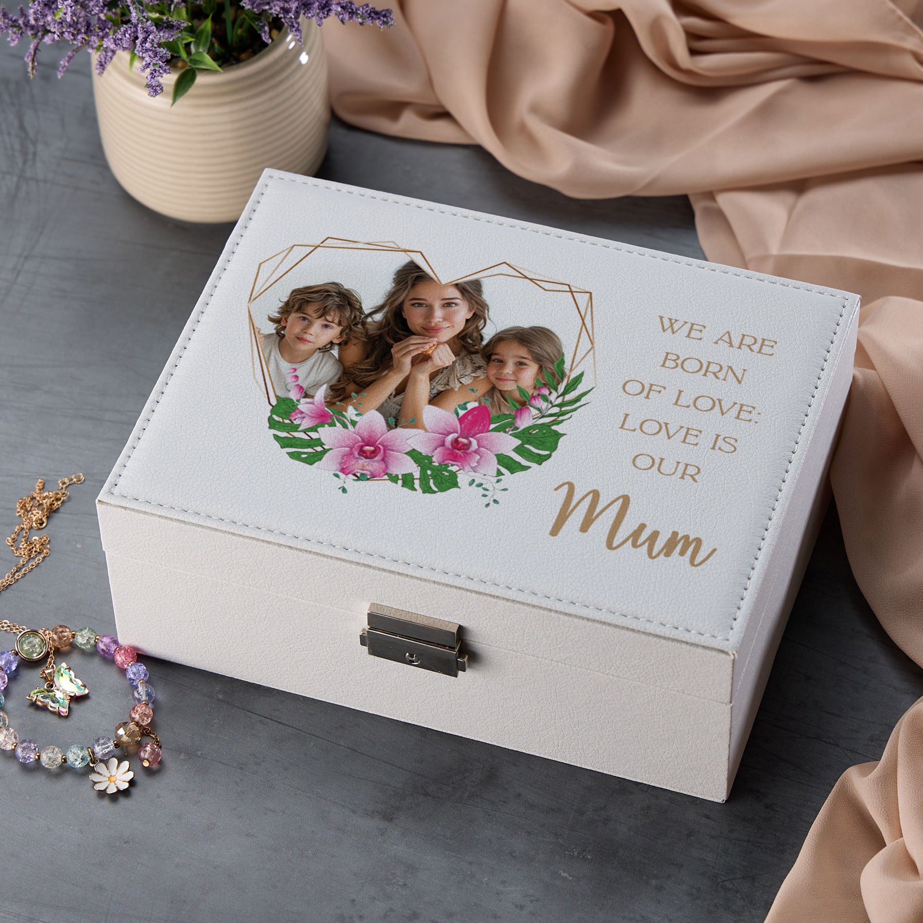 This personalised luxury jewellery box is a perfect keepsake gift for Mum, Mummy, or Mam. It features a custom photo beautifully displayed within an elegant floral frame, adding a personal and heartfelt touch. Crafted with care, this jewellery box not only offers stylish storage but also serves as a cherished reminder of special moments. Ideal for birthdays, Mother’s Day, or any occasion, it blends functionality with meaningful customization to make a truly memorable present.