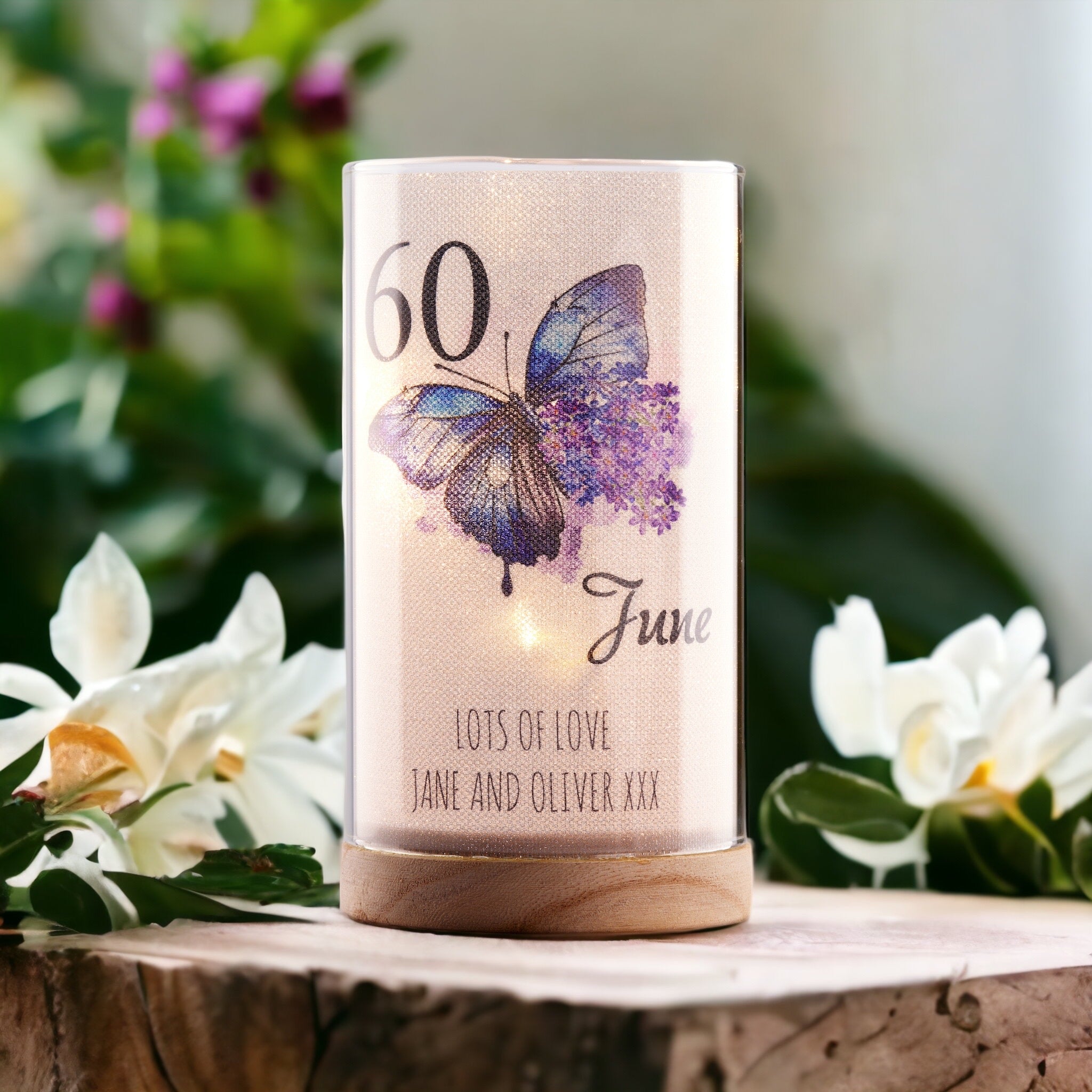 Make an unforgettable gift for a 60th birthday with this personalised night lamp. The unique wooden base and butterfly motif add a touch of style and beauty. The perfect reminder of a special birthday.