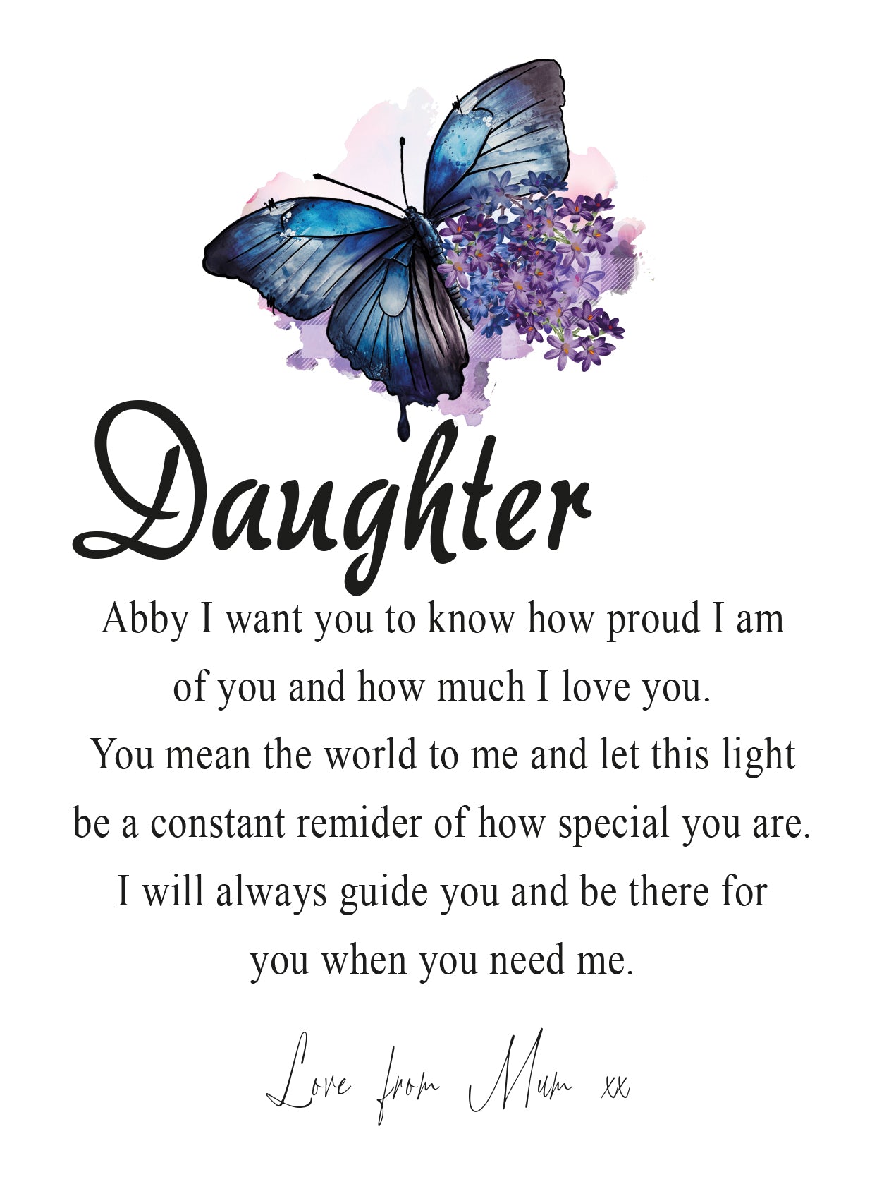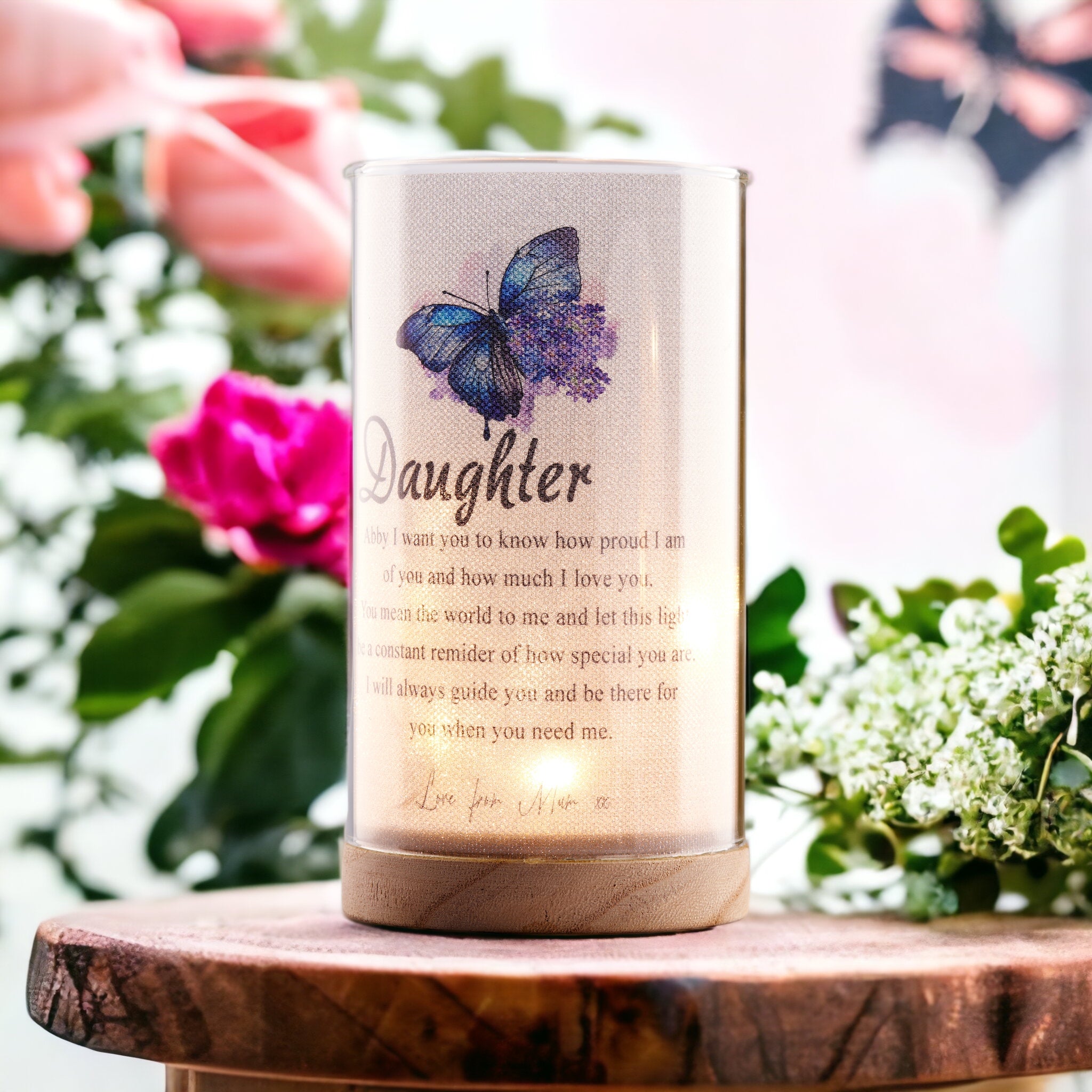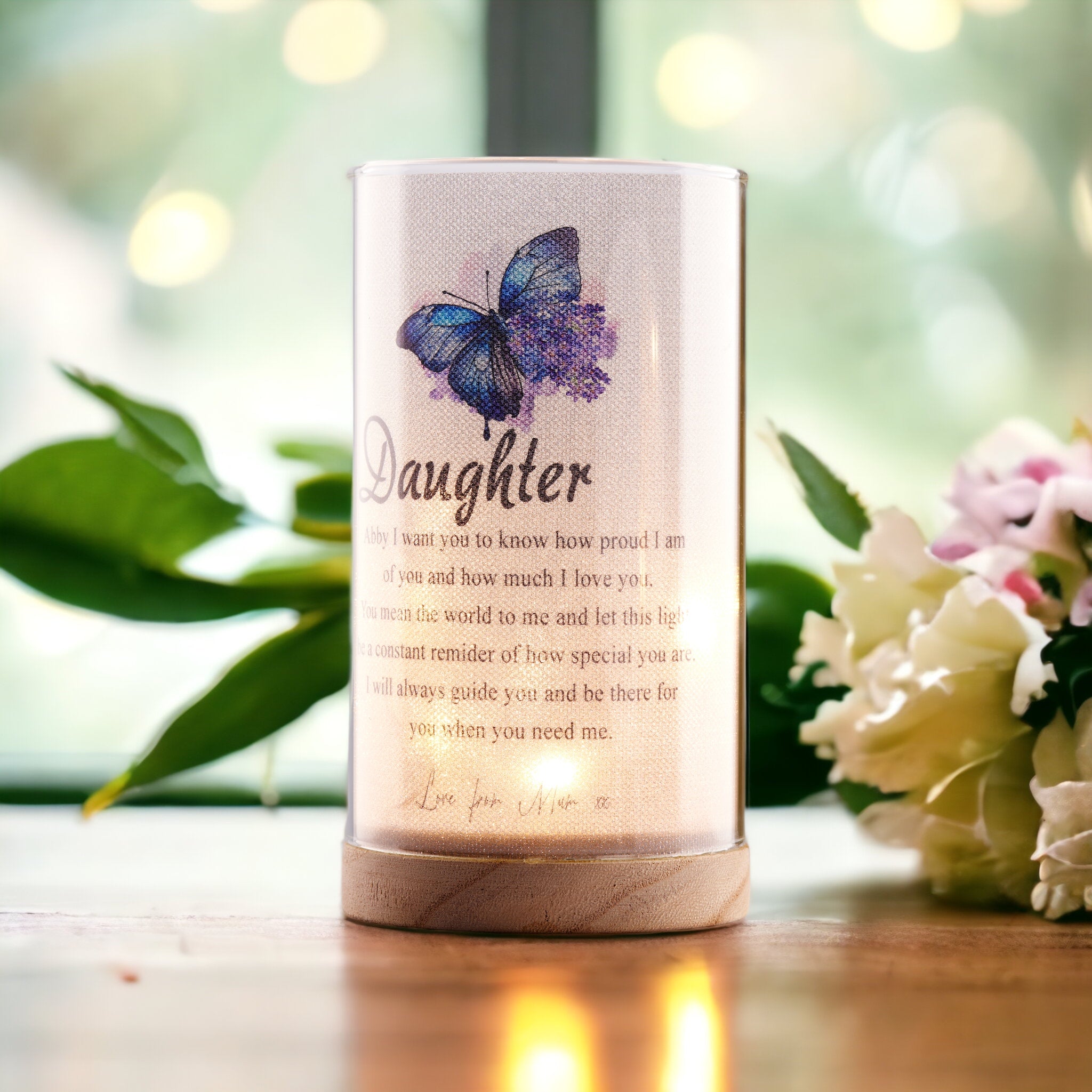 Surprise your daughter on her special day with this beautiful night lamp featuring an engraved sentiment on a wooden base. Hand-crafted with exquisite attention to detail, this Personalised Daughter Gift includes the words "Love" and special occasions like birthdays and Christmas. Perfect for brightening her bedroom or living room.