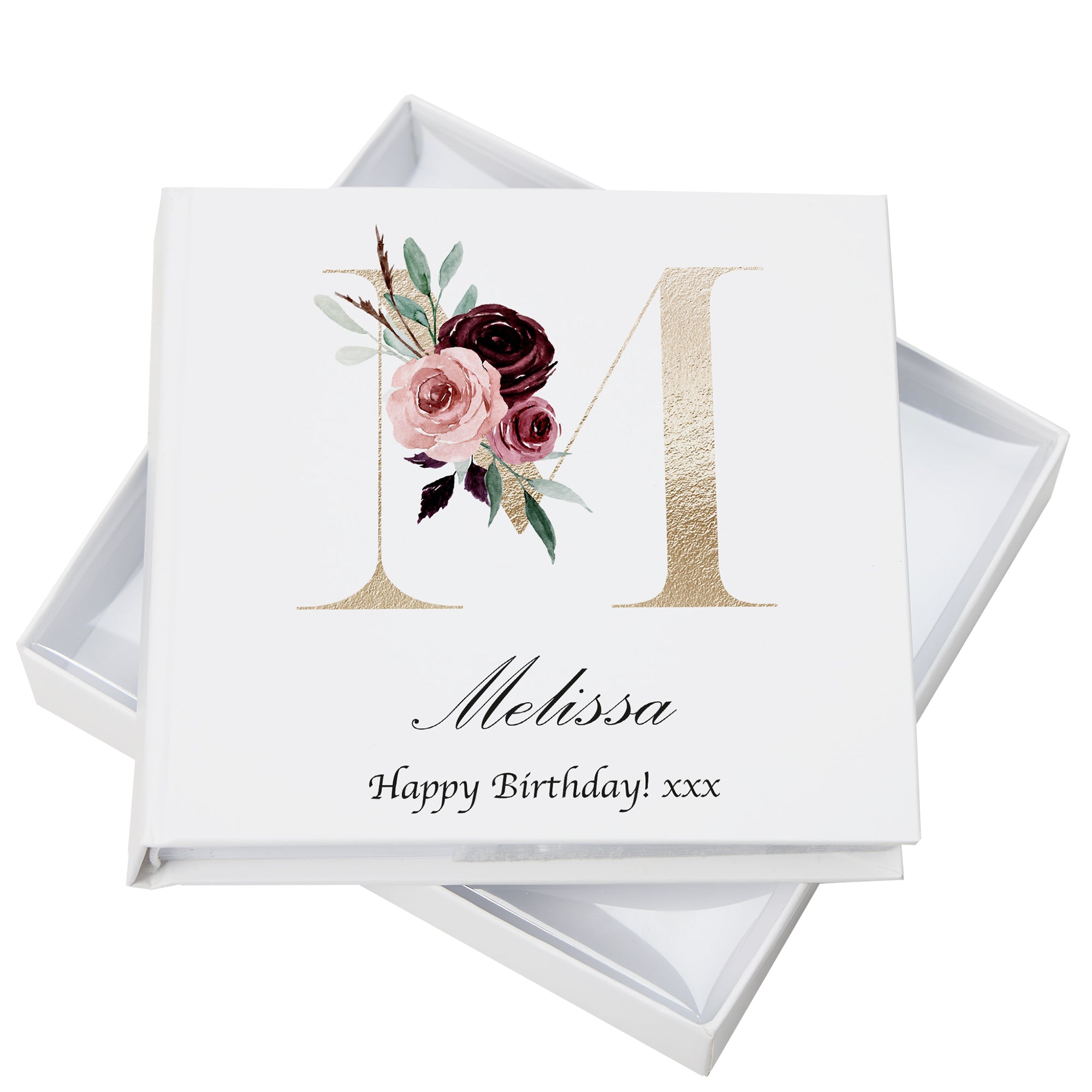 Featuring a distinctive gold letter monogram paired with a heartfelt sentiment on the cover, this album offers a refined way to showcase your photos. It holds 50 slip-in 4" x 6" photos, each accompanied by dedicated space for notes or reflections, allowing you to capture the stories and emotions behind each moment. With dimensions of approximately 18.5cm by 19.5cm, the album strikes the perfect balance between compactness and ample storage. Delivered in a sleek, stylish box, it makes an ideal keepsake or gift for a loved one. Personalisation options include adding a name, a selected letter, and a meaningful sentiment, ensuring your album becomes a one-of-a-kind keepsake to be cherished for a lifetime.