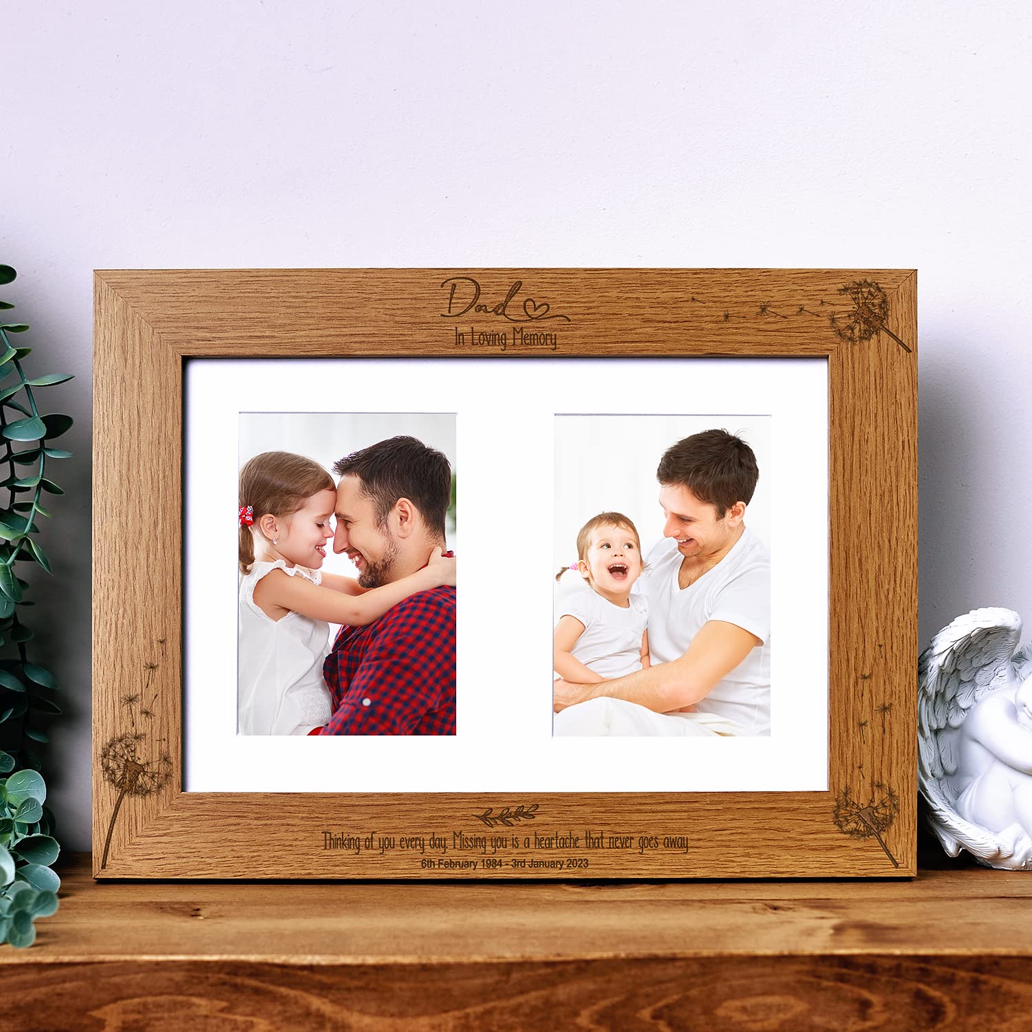 The frame has a oak wood finish with the engraving Dad in loving memory on top along with a fixed sentiment and personalised dates to the bottom. The photo frame will hold two standard 6" x 4" photos The personalisation is done via a laser engraver giving a deep engraved finish.. When adding the personalisation please state the following Dates required