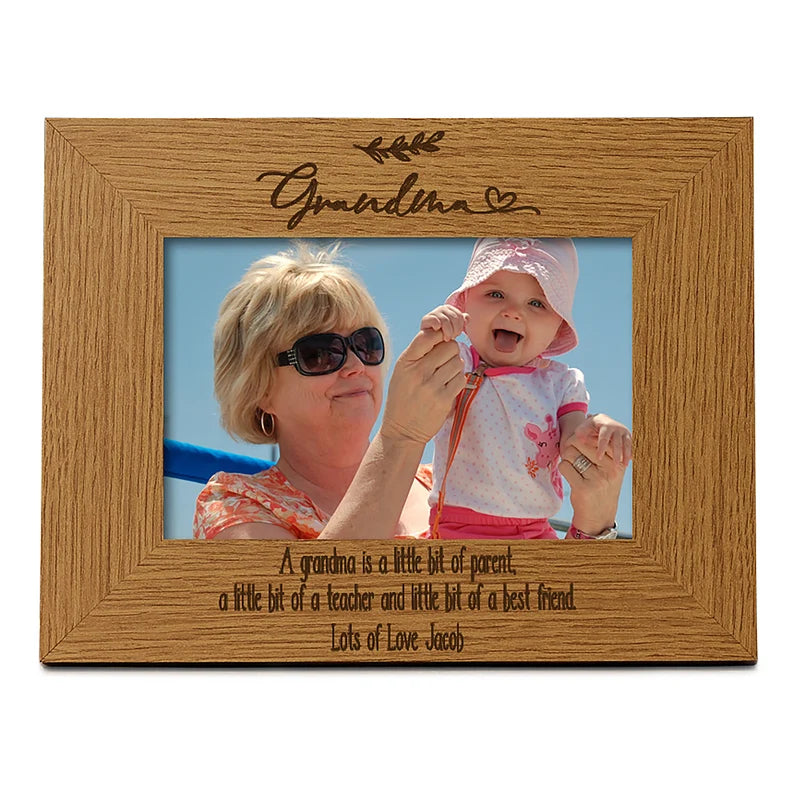 The frame has a oak wood finish with and comes with "Grandma" on top and a sentiment below with the bottom line being your personalised wording Please select the photo frame size you require, the sizes are for the photo size. There is a stand at the rear so will sit flat on any surface. Please simply message us during checkout but should you miss it then simply message us with your requirements from your order We just need the bottom line for engraving.