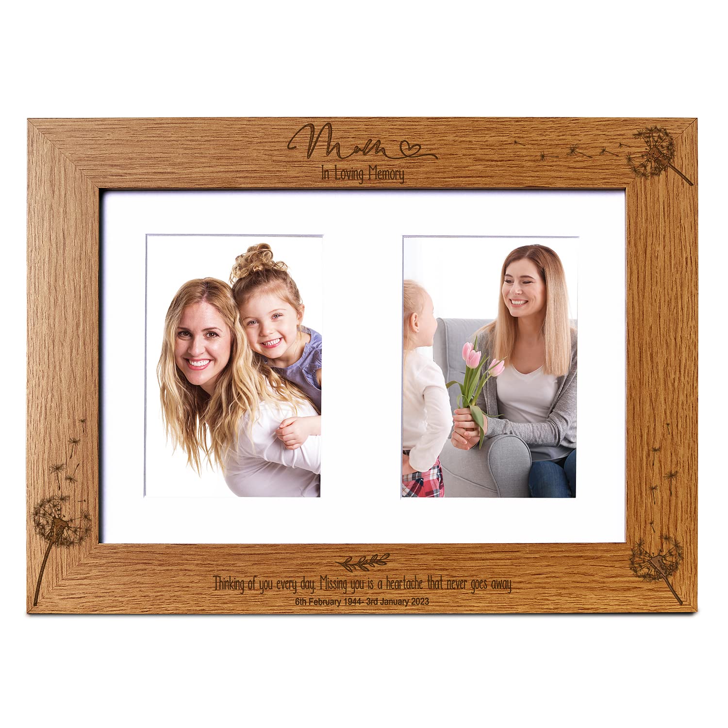 The frame has a oak wood finish with the engraving Mum in loving memory on top along with a fixed sentiment and personalised dates to the bottom. The photo frame will hold two standard 6" x 4" photos The personalisation is done via a laser engraver giving a deep engraved finish..