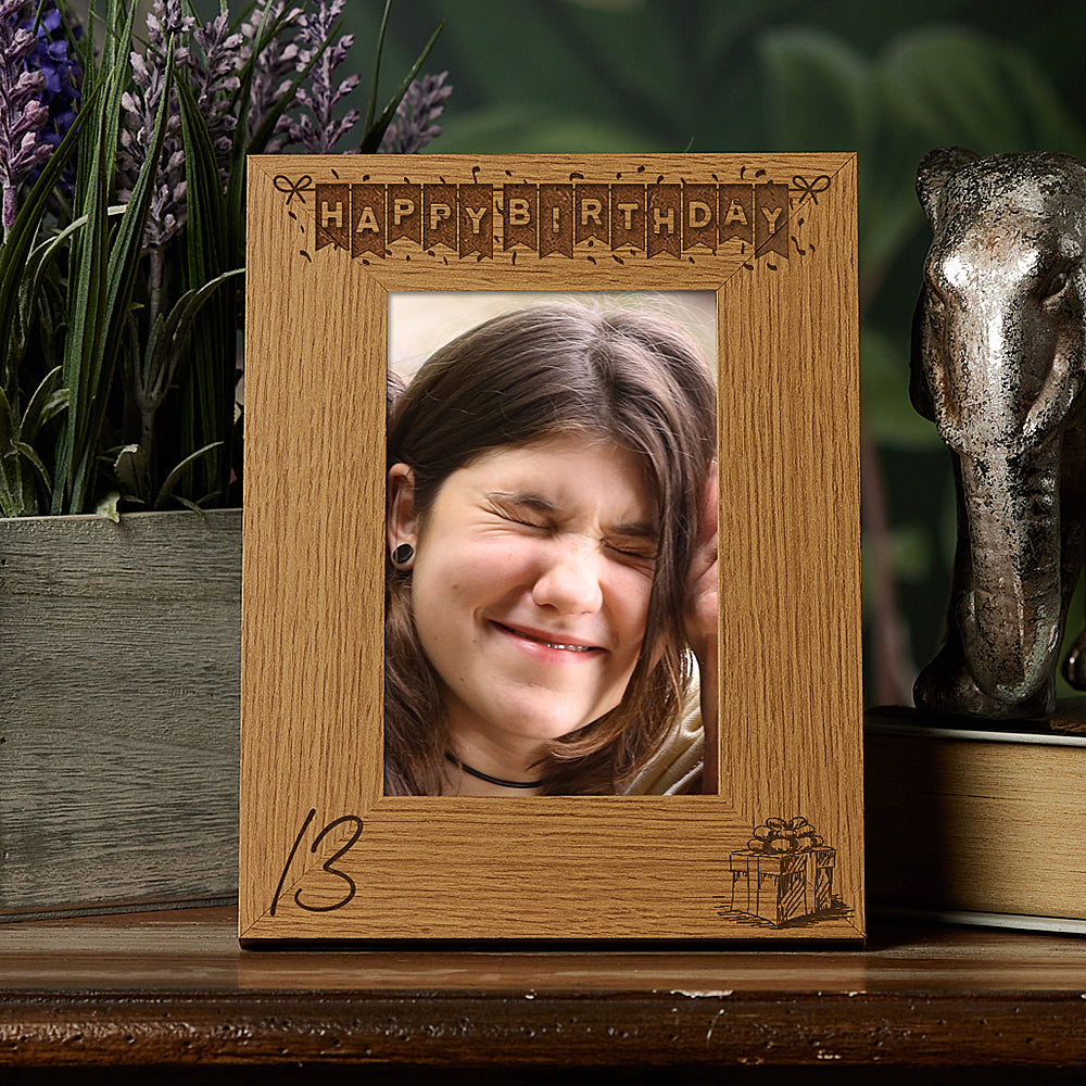 Wooden photo frame perfect for displaying treasured 13th birthday memories. The frame has a oak wood finish...