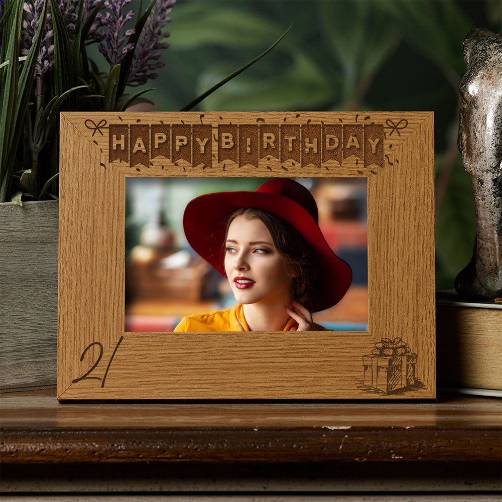 The frame has a oak wood finish with the engraving of Happy Birthday in a banner style on top and the age below.