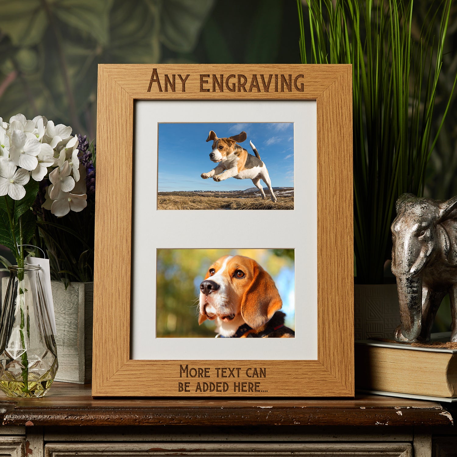 A lovely wooden frame to display those all important or memorable photos. The frame has a oak wood finish with the engraving of your choice. The photo frame will hold two standard 6" x 4" photos The personalisation is done via a laser engraver giving a deep engraved finish.. Should you forget to add a note please mail us under your order with your requirements.