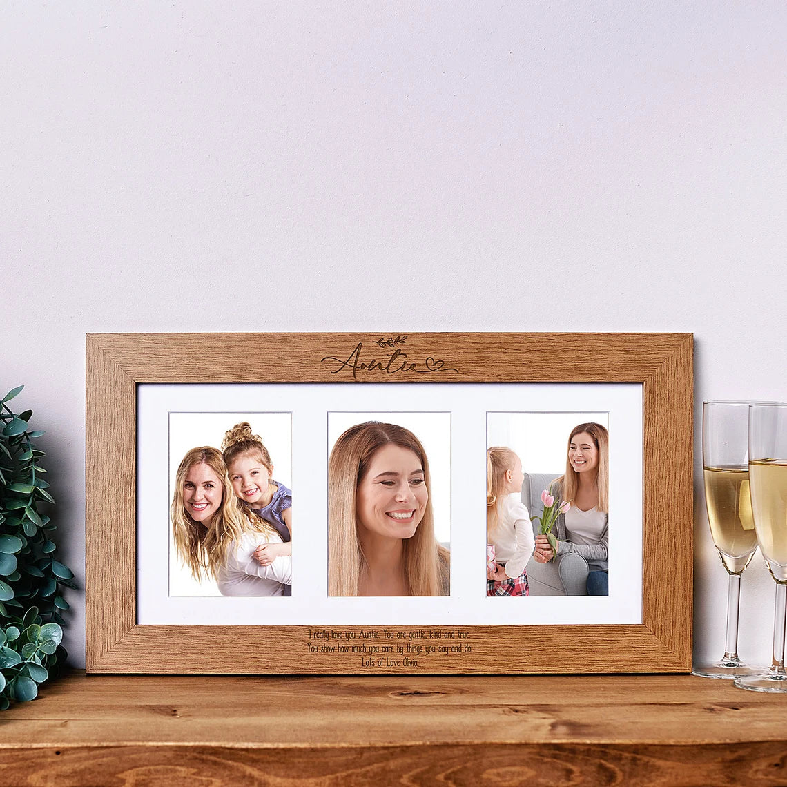 The frame has a white wood finish with the engraving of your choice. The photo frame will hold three standard 6" x 4" photos The frame is for wall hanging as there is a hook to the rear. The personalisation is done via a laser engraver giving a deep engraved finish.. Should you forget to add a note please mail us under your order with your requirements.