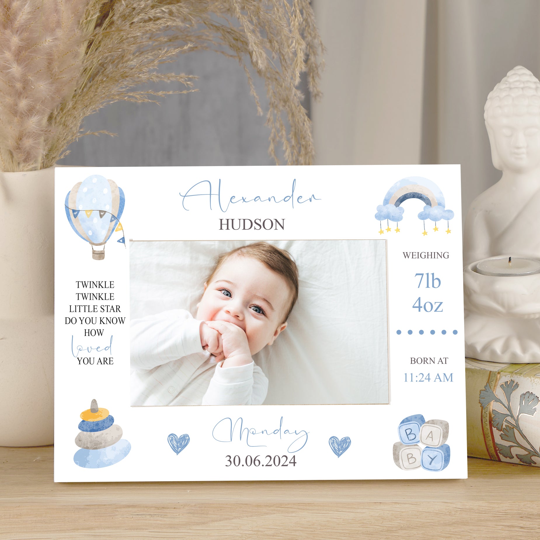 Personalised Baby Boy Photo Frame With Birth Details and Cute Watercolour Design