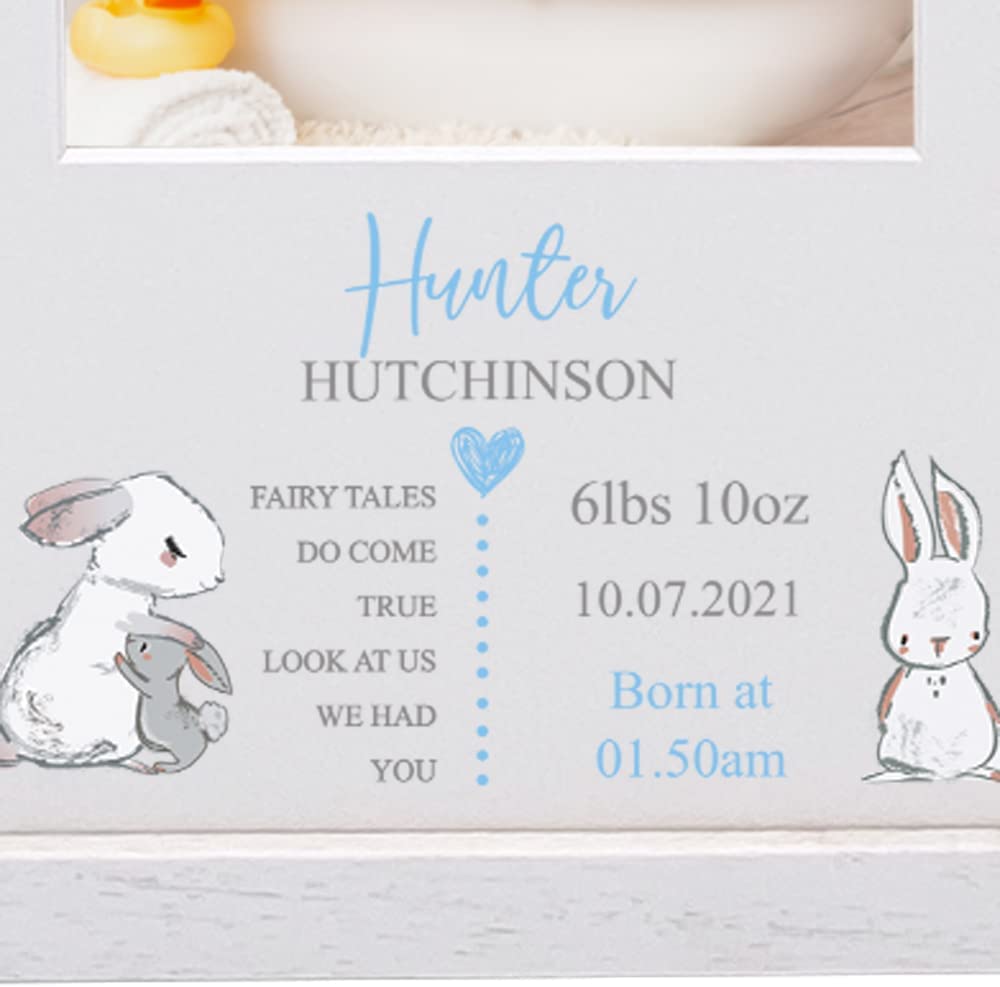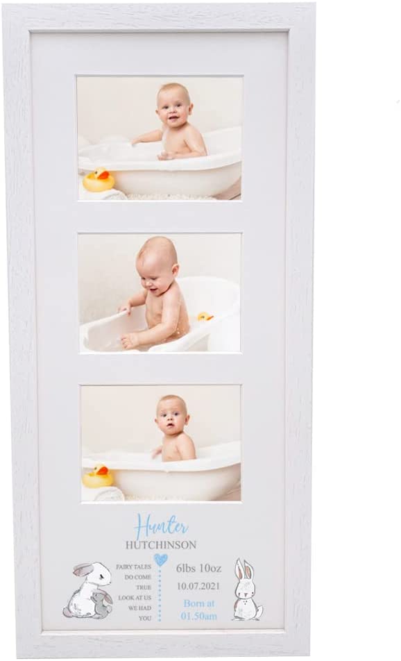 The frame is made with white wood and comes with birth details and rabbit design. The insert in the frame is included and holds three 4" x 3" photos .