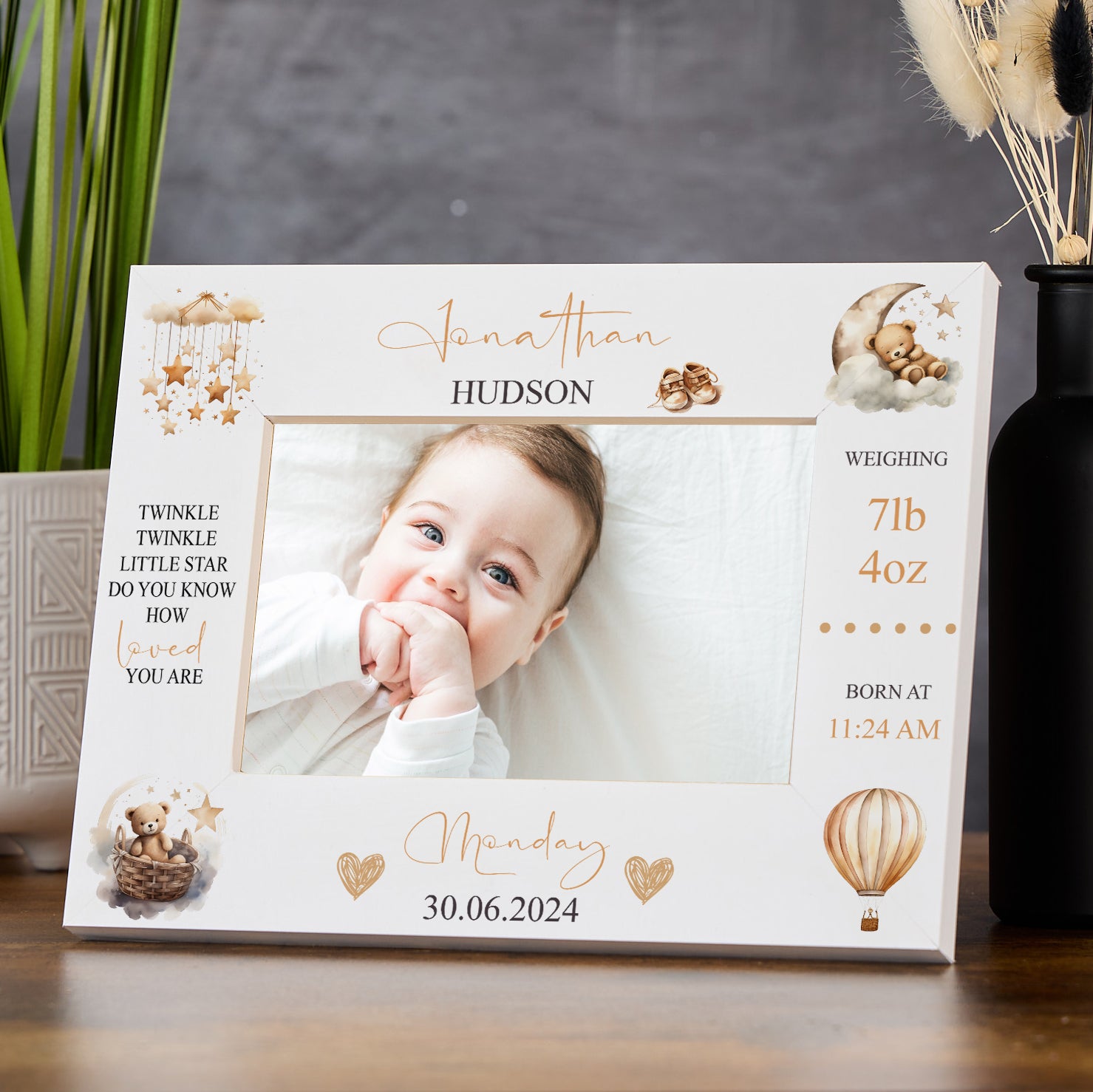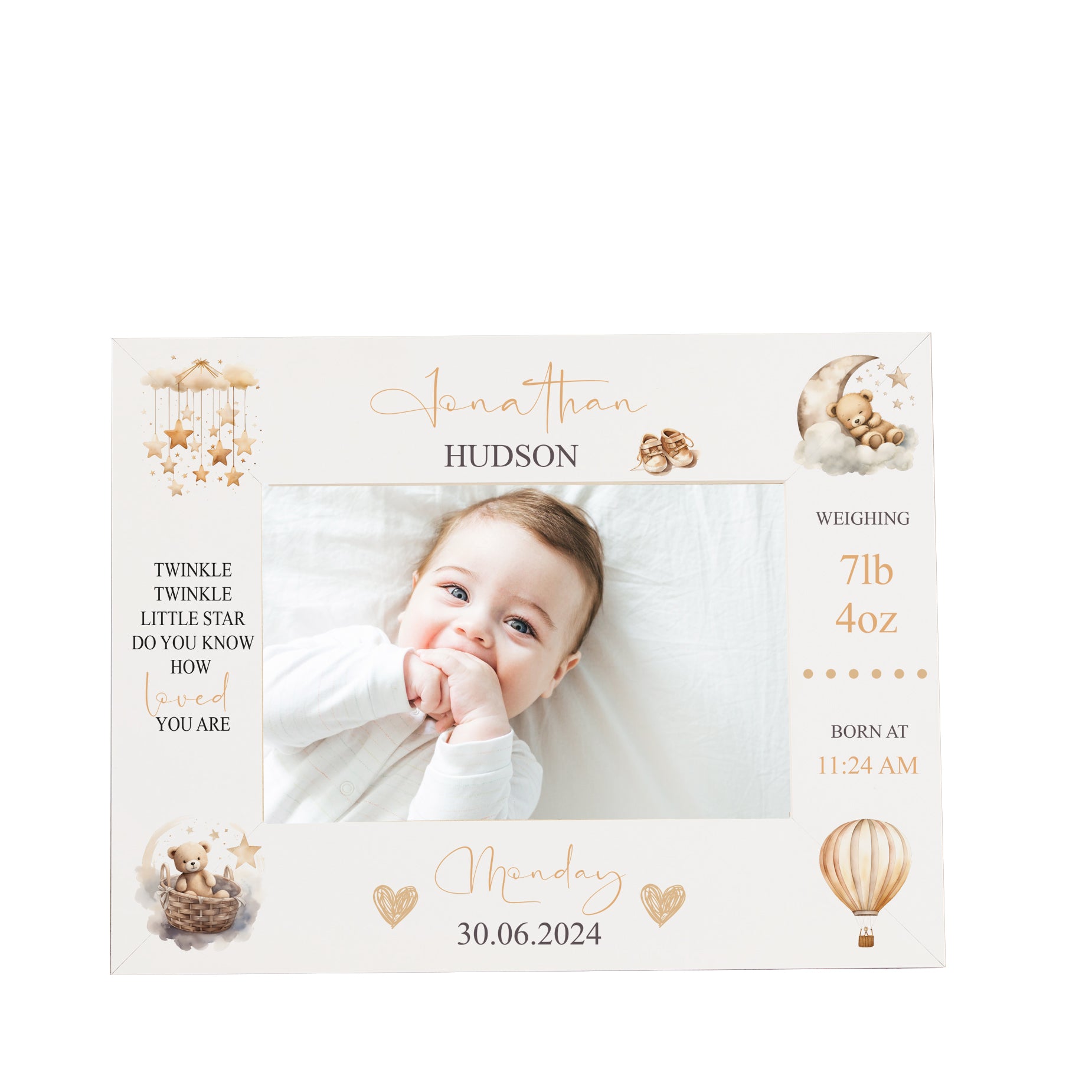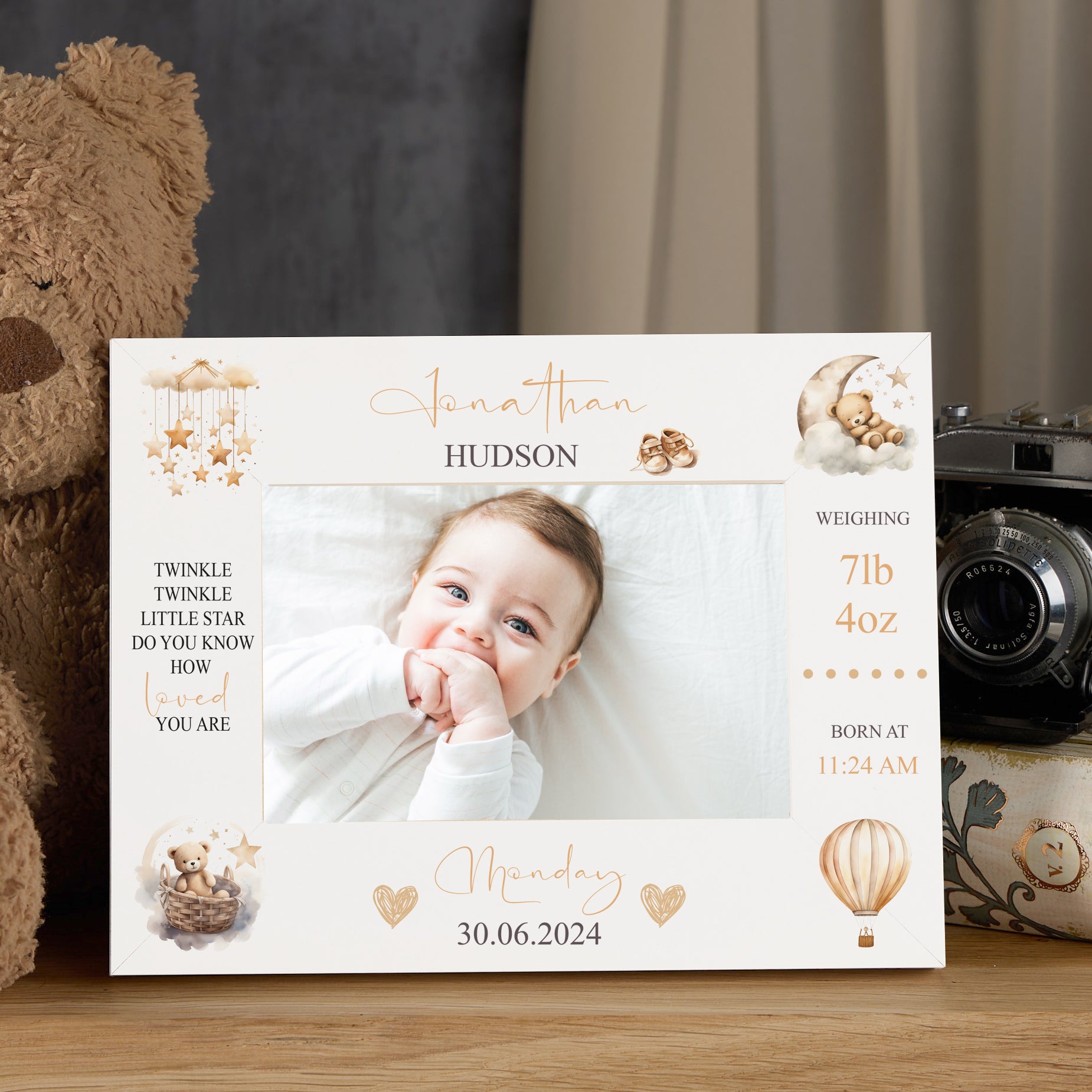 Personalised baby photo frame featuring birth details and an adorable teddy design. This personalised baby photo frame...