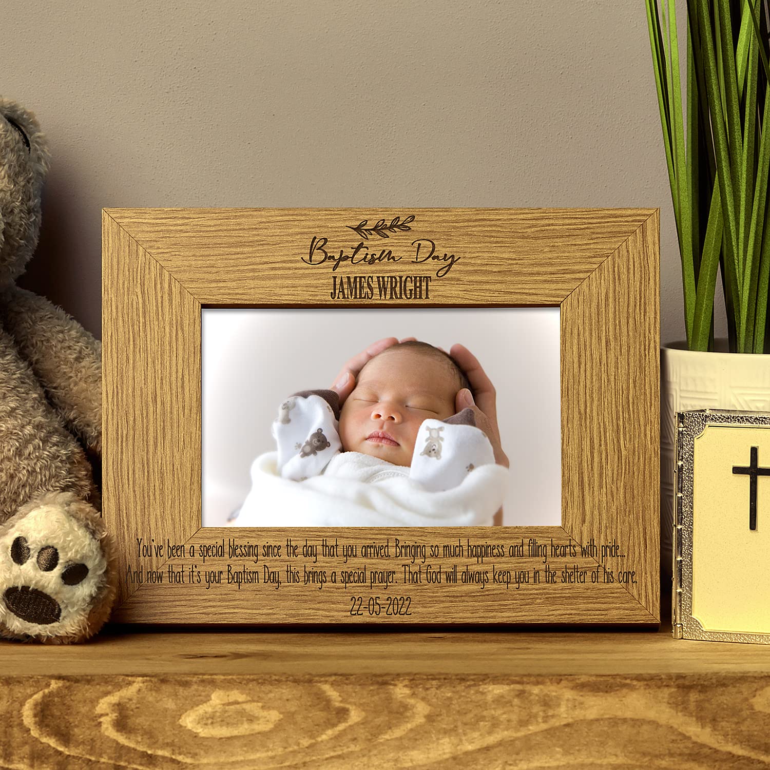 Customize this wooden photo frame for a special baptism day photo. The frame has a solid wood...