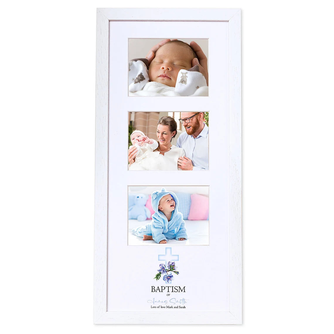 Personalised Baptism Day Triple Photo Frame With Blue Cross
