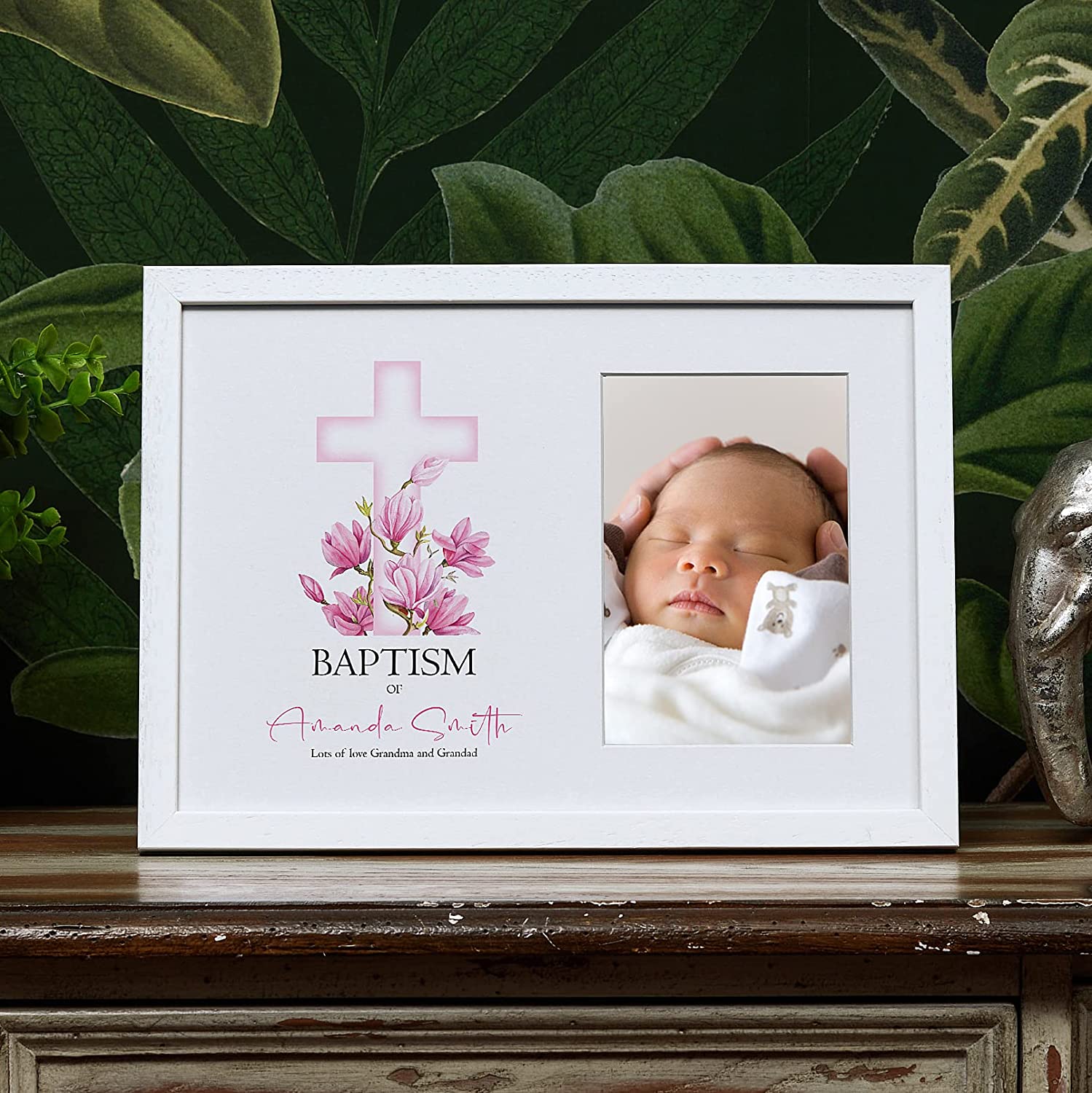 Personalised Baptism White Photo Frame With Pink Cross 6"x4"