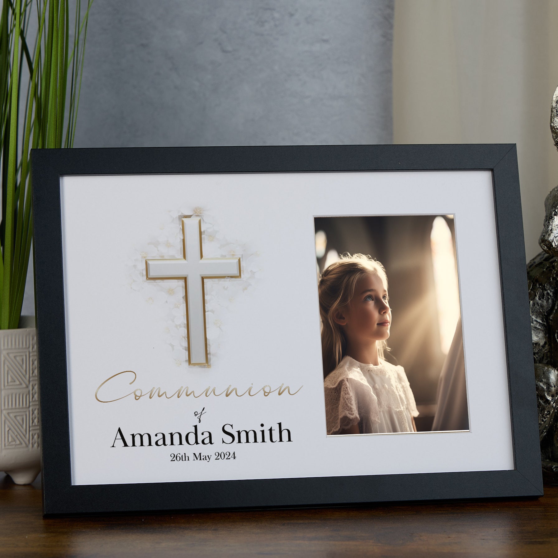 This personalised elegant Communion photo frame is a timeless keepsake designed to commemorate a special occasion. Crafted with care, it features a delicate silver cross that adds a meaningful touch. Customise it with a cherished photo to create a unique memento that honours the significance of the Communion day. Its classic design ensures it complements any décor, making it a treasured gift and lasting reminder for years to come.