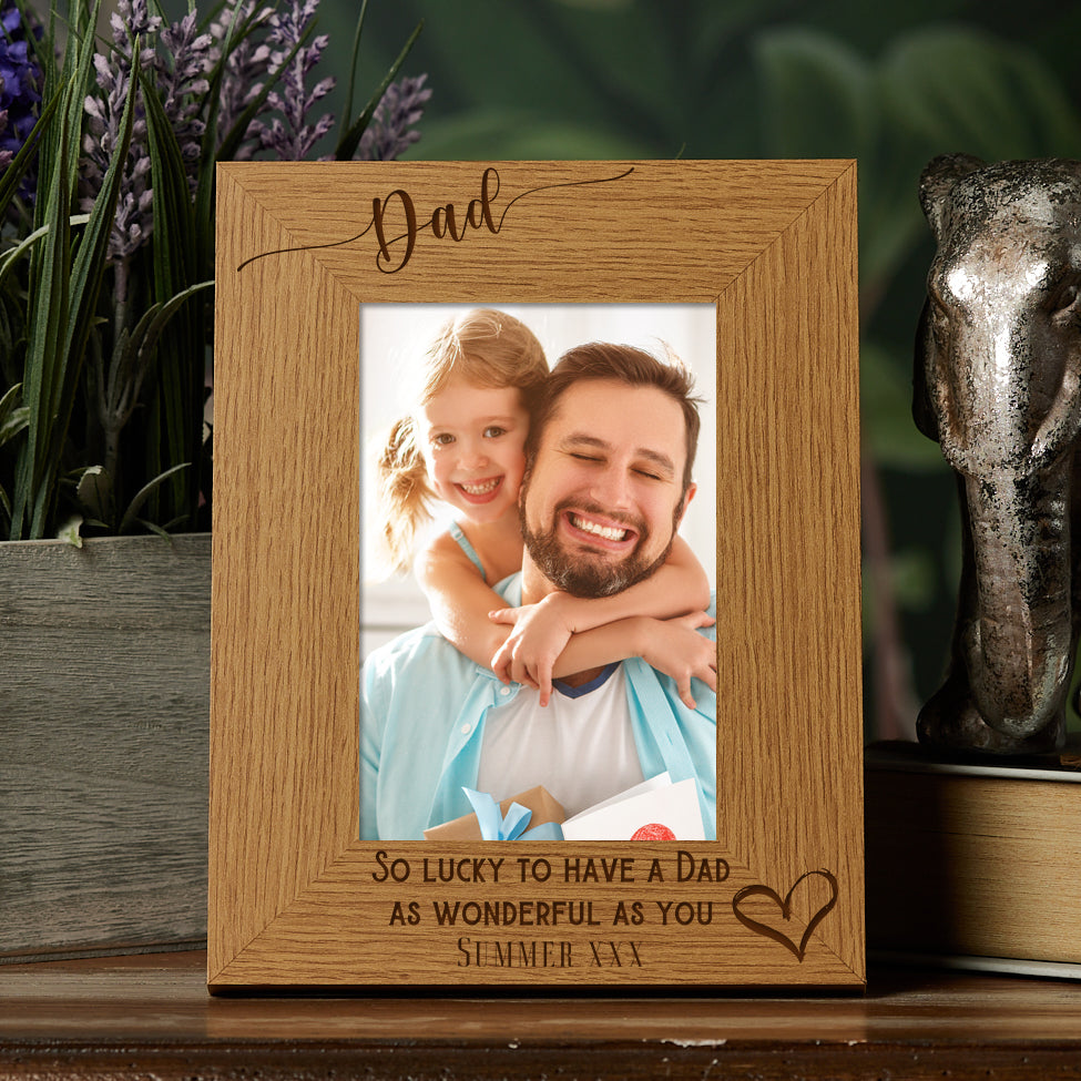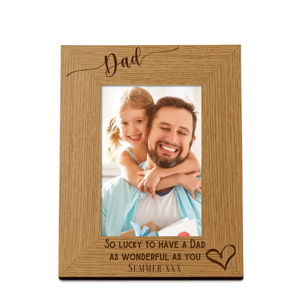 The Personalised Dad Love Heart Engraved Portrait Photo Frame Gift features a classic oak wood finish that exudes warmth and quality. At the top, the frame is engraved with "Dad," accompanied by the heartfelt message, "So lucky to have a Dad as wonderful as you." Below this, you can add your own personalized wording to create a truly unique and meaningful tribute. You have the option to select the photo frame size that best fits your chosen picture, ensuring an ideal display. Equipped with a sturdy stand at the rear, this frame sits securely on any flat surface such as desks, shelves, or mantelpieces. Combining elegant craftsmanship with personal sentiment, this frame makes an enduring gift to celebrate the special bond with your father.