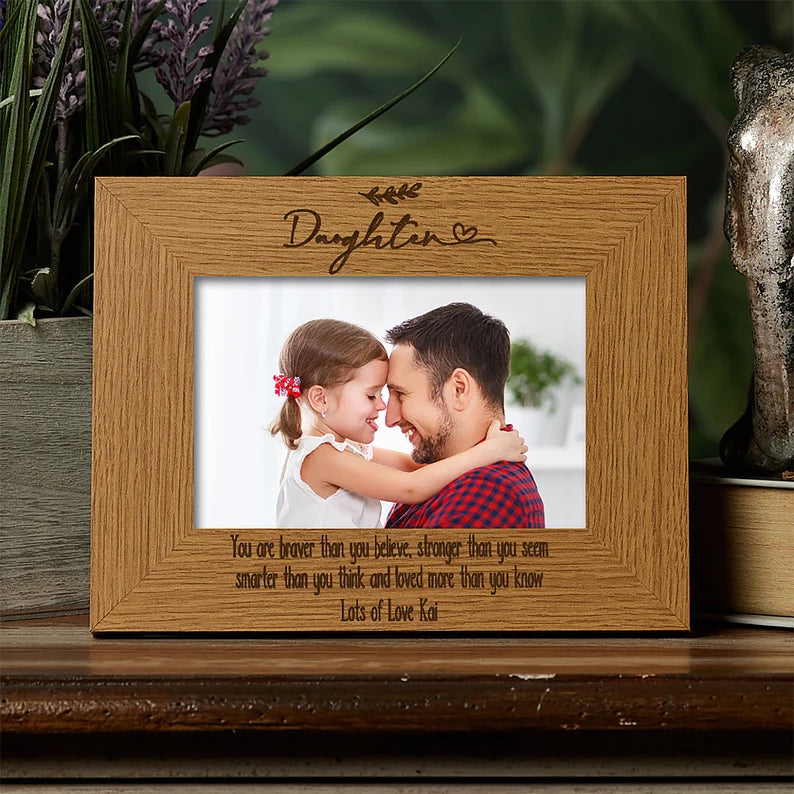 The frame has a solid wood finish with the engraving of "Daughter"...and "You are braver than you believe, stronger than you seem, smarter than you think and loved more than you know" to the bottom along with the engraving of your choice. Please select the photo frame size you require, the sizes are for the photo size. Can be both wall hung as well as stood flat.
