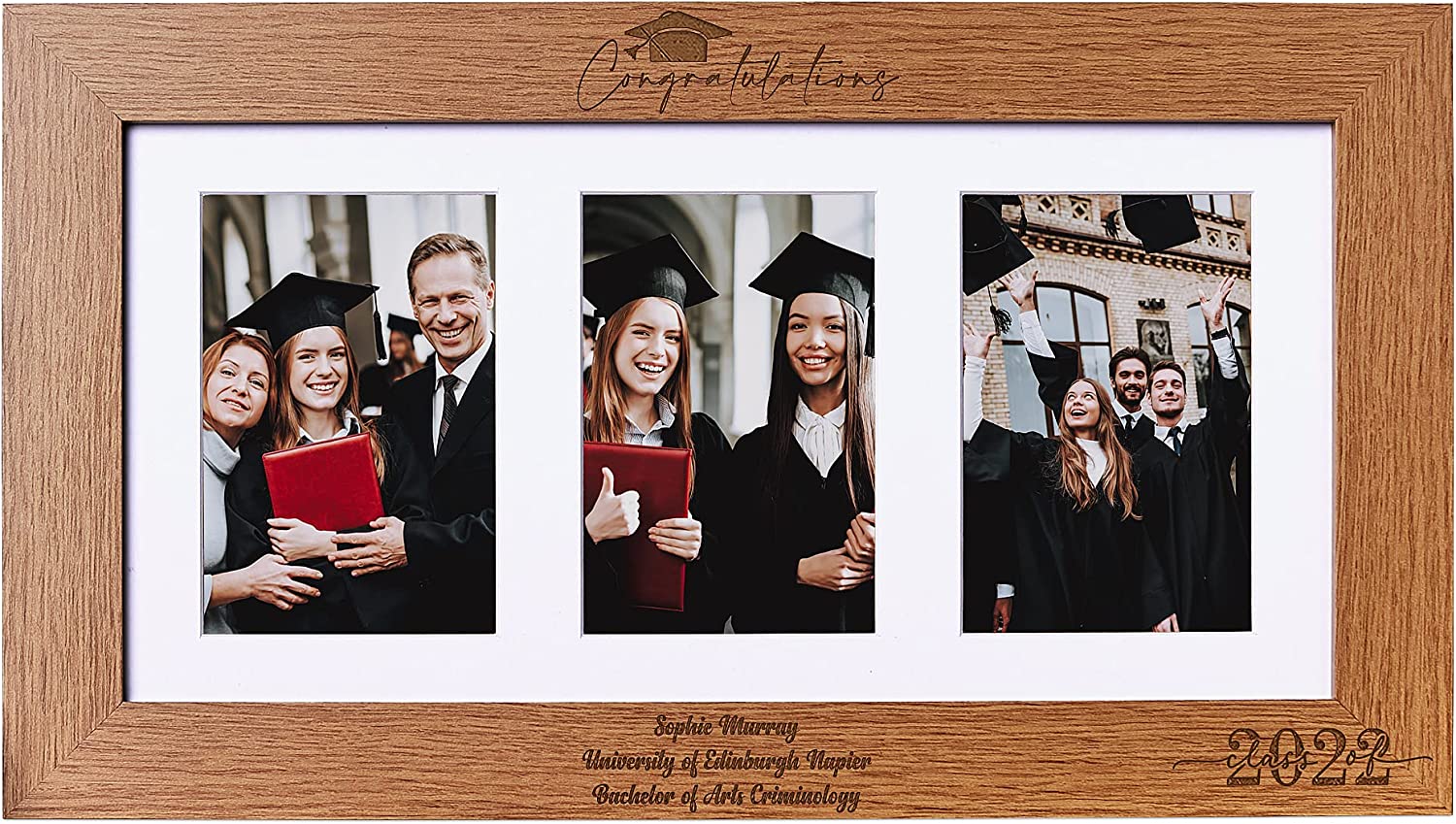 The frame has a oak wood finish with the engraving of one's graduation. The photo frame will hold three standard 6" x 4" photos The personalisation is done via a laser engraver giving a deep engraved finish.. Should you forget to add a note please mail us under your order with your requirements.
