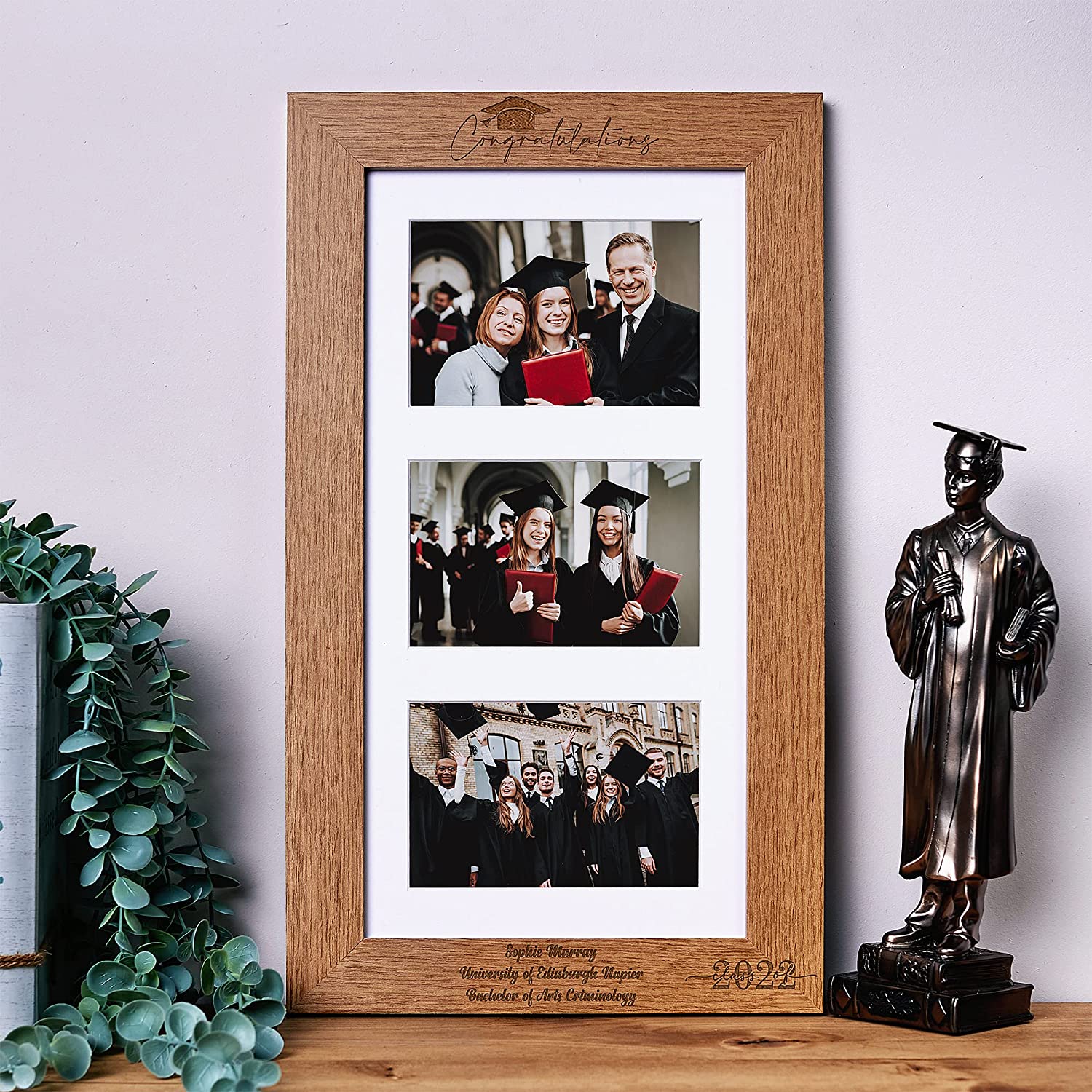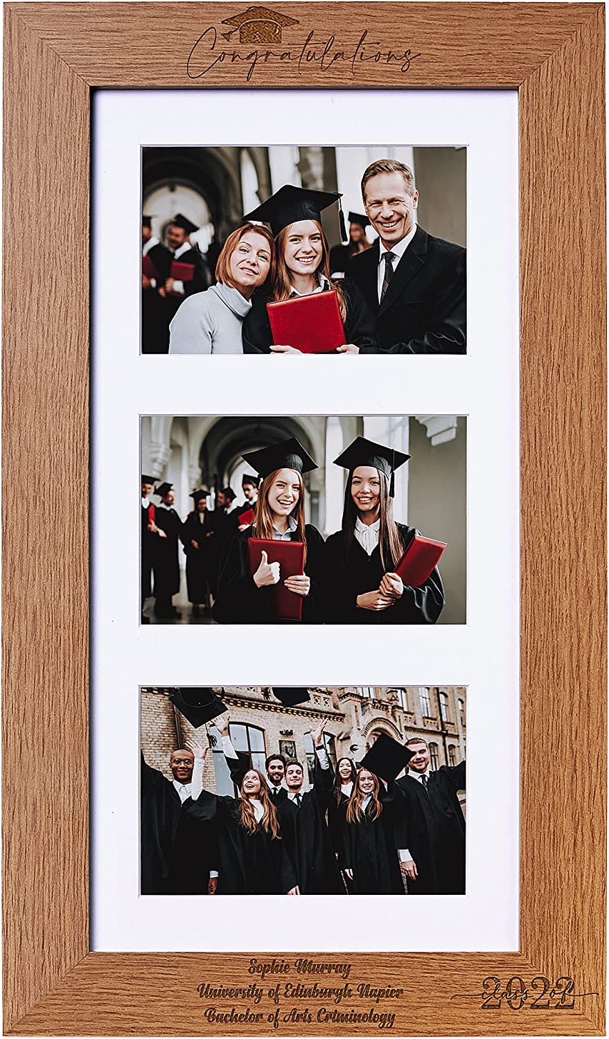 The frame has a oak wood finish with the engraving of one's graduation. The photo frame will hold three standard 6" x 4" photos The personalisation is done via a laser engraver giving a deep engraved finish..