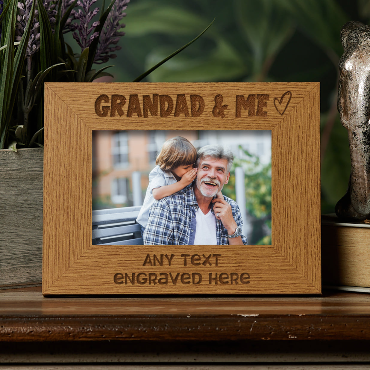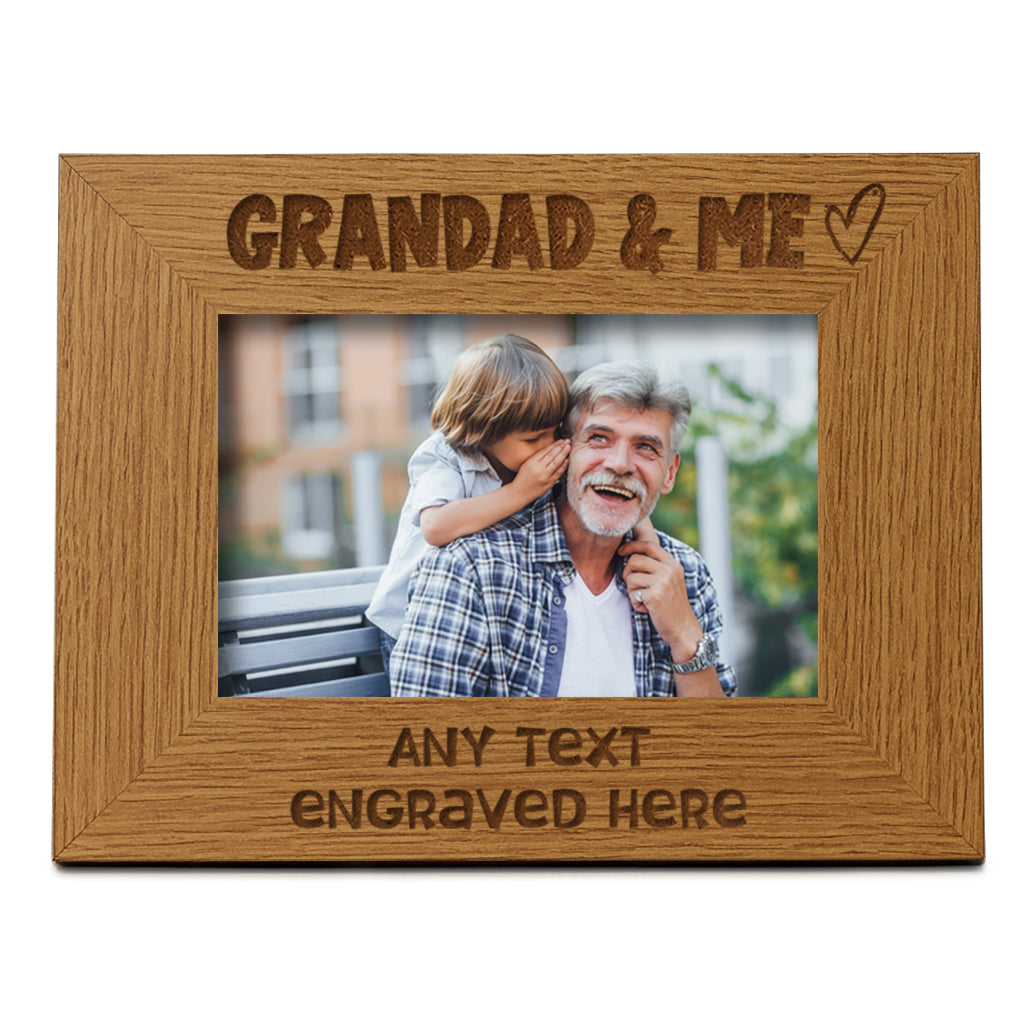 A lovely wooden frame to display that all important or memorable photo .The frame has a oak wood finish with and comes with "Grandad and Me" on top and a heart design to the side