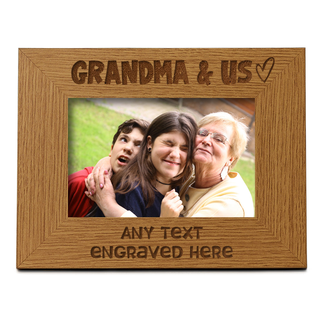 A lovely wooden frame to display that all important or memorable photo .The frame has a oak wood finish with and comes with "Grandma and Us" on top and a heart design to the side