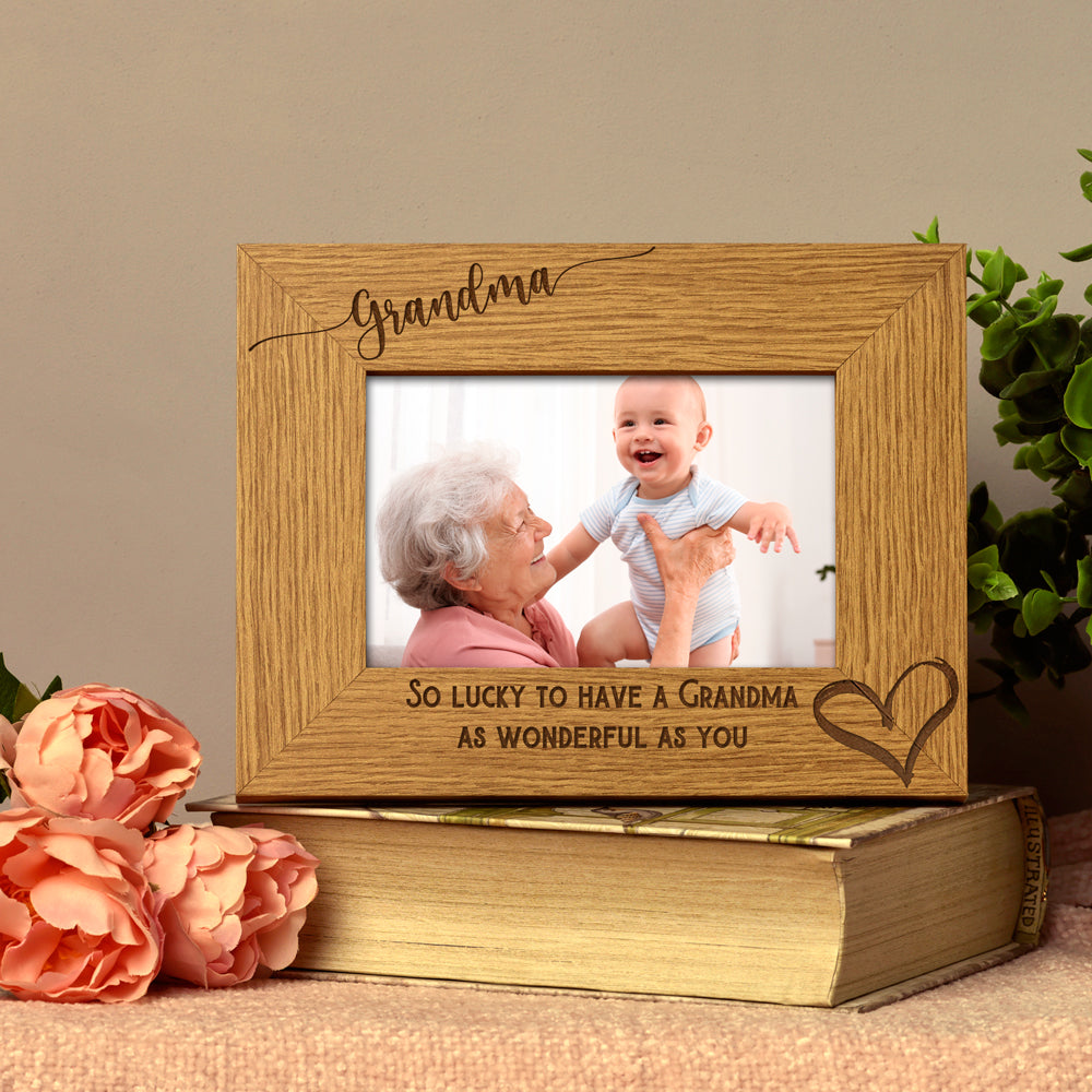 A lovely wooden frame to display that all important or memorable photo. The frame has a solid wood finish with the engraving of "Grandma" on top along with "So Lucky to have a Grandma as wonderful as you" and then the personalisation of your choice. Please select the photo frame size you require, the sizes are for the photo size.