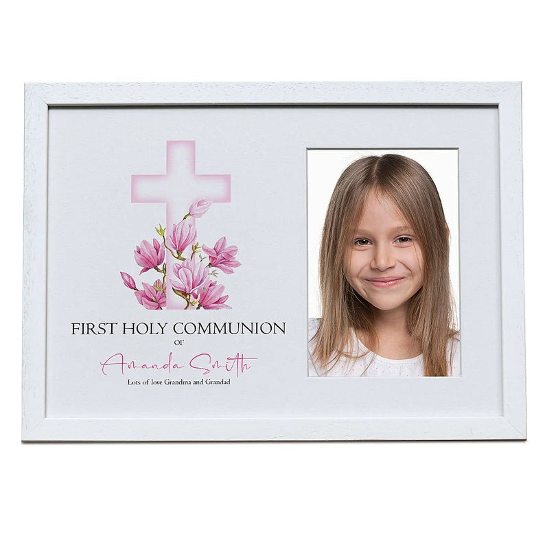 Personalised Holy Communion White Photo Frame With Pink Cross 6"x4"