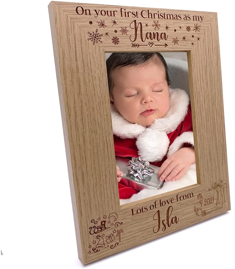 The frame has a oak wood finish with the engraving of "On your first Christmas as nana" on top while underneath you have a name and year Please select the photo frame size you require, the sizes are for the photo size. There is a stand at the rear so will sit flat on any surface. All you have to do is message us in the gift section with your wording when checking out or if you forget or miss it then simply message us through your order.