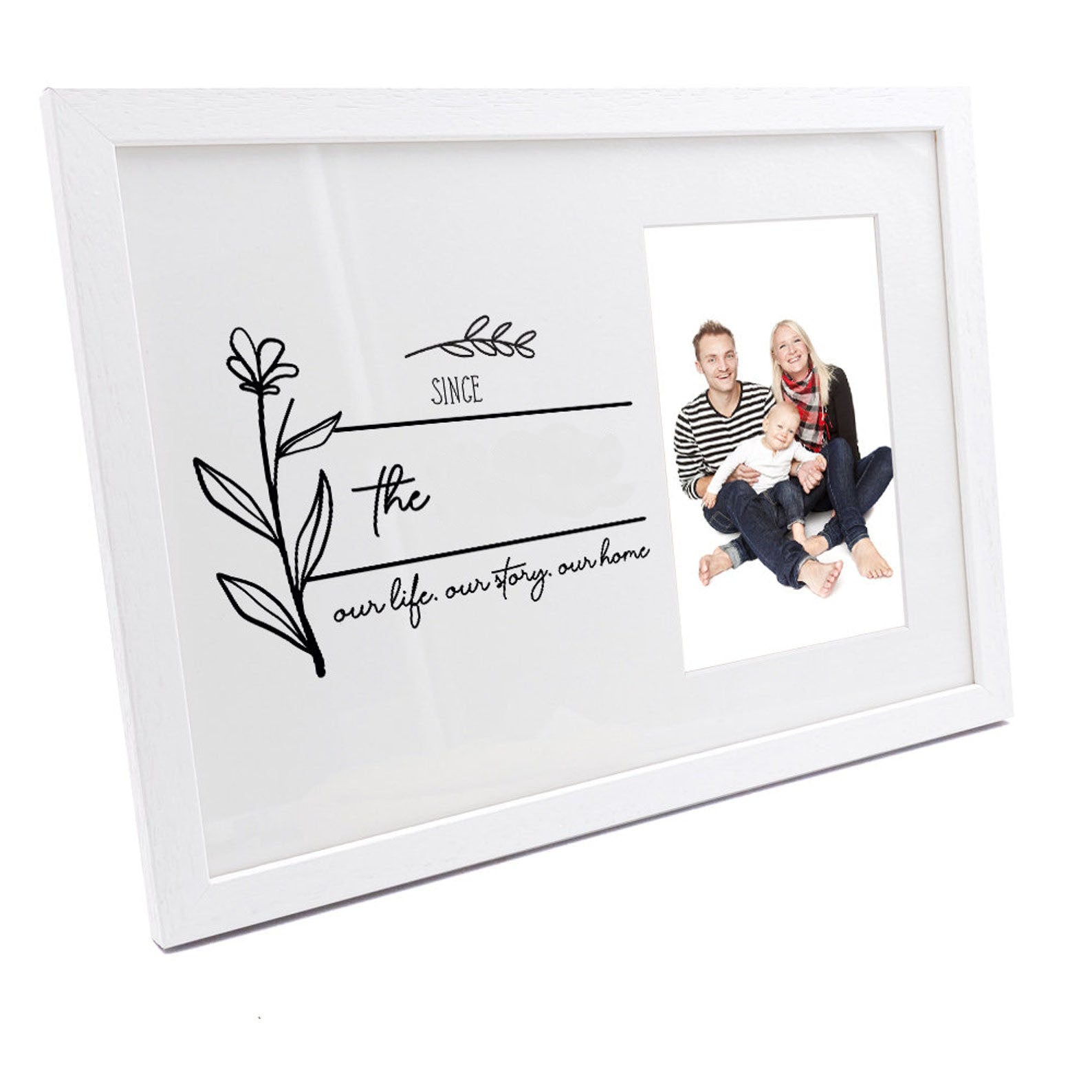 The frame has an white wood finish with the personalised writing on the left and room for a 6" x 4" photo to the right There is a stand at the rear so will sit flat on any surface.