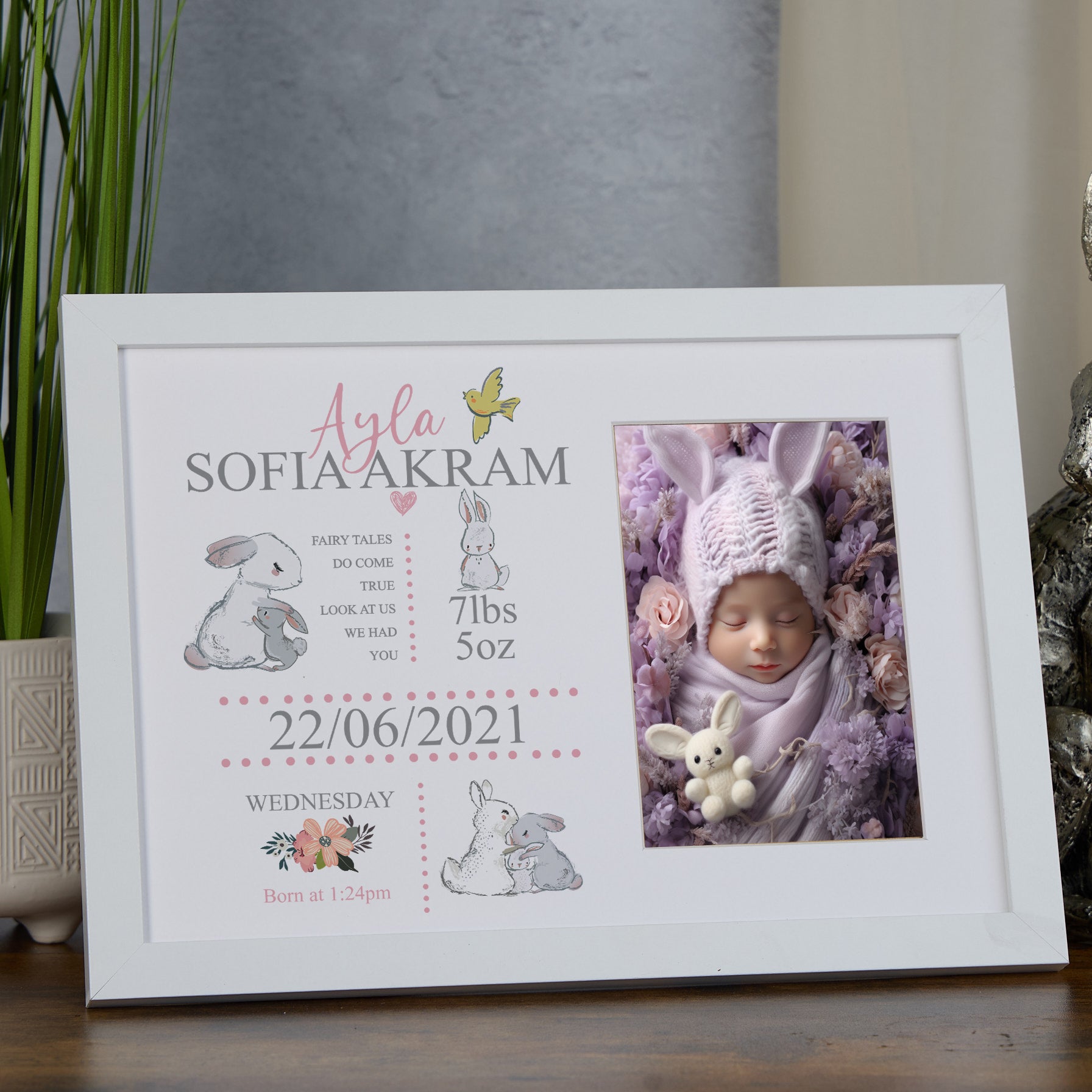 This personalised rabbit-themed photo frame is an ideal keepsake for celebrating the arrival of a baby girl. Designed to hold a cherished photo, it adds a delicate and thoughtful touch to nursery décor. The frame’s customised feature makes it a unique newborn gift, perfect for preserving precious memories. Crafted with care, it serves as a lasting memento to treasure throughout the years.