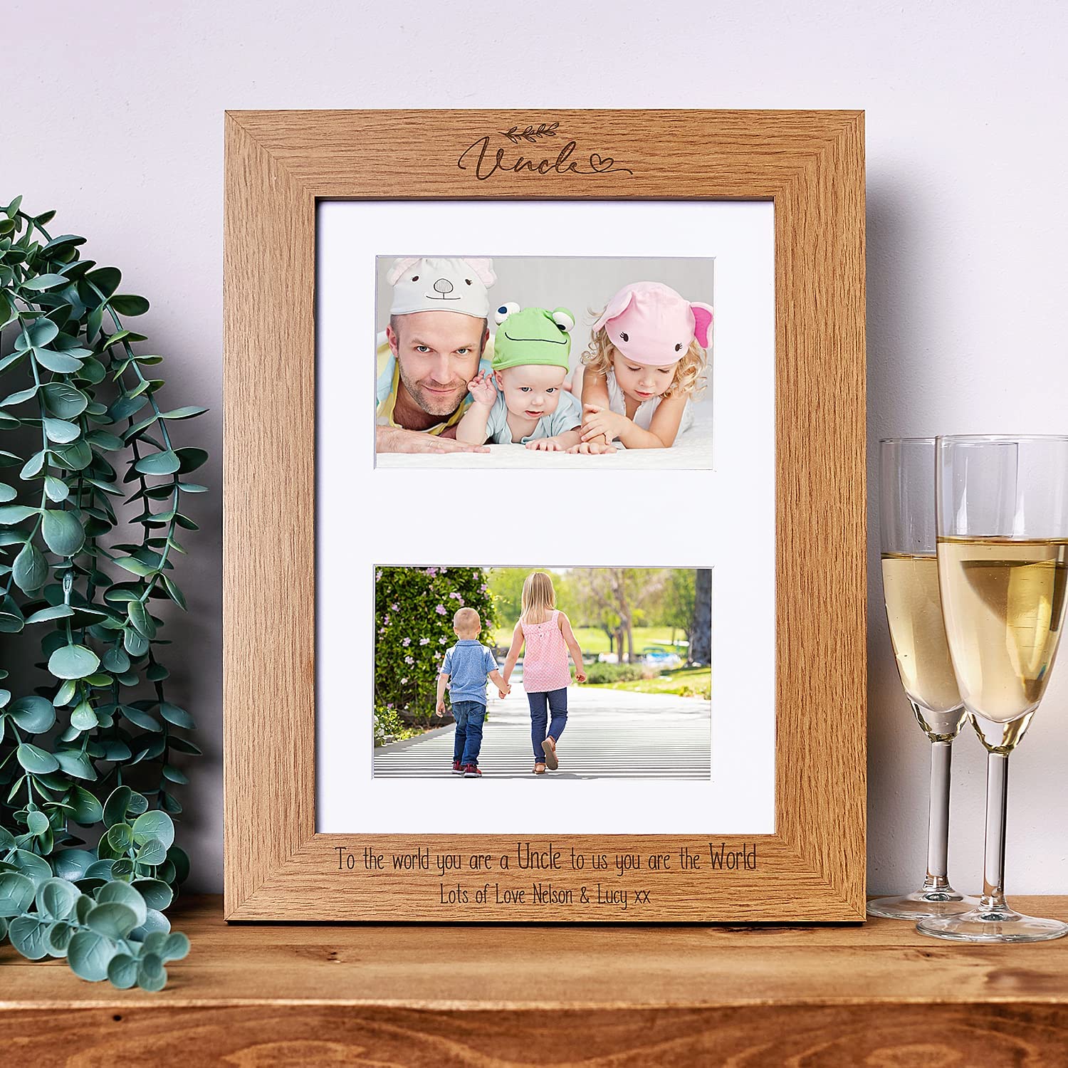 The frame has a oak wood finish with the engraving of your choice. The photo frame will hold two standard 6" x 4" photos The personalisation is done via a laser engraver giving a deep engraved finish..