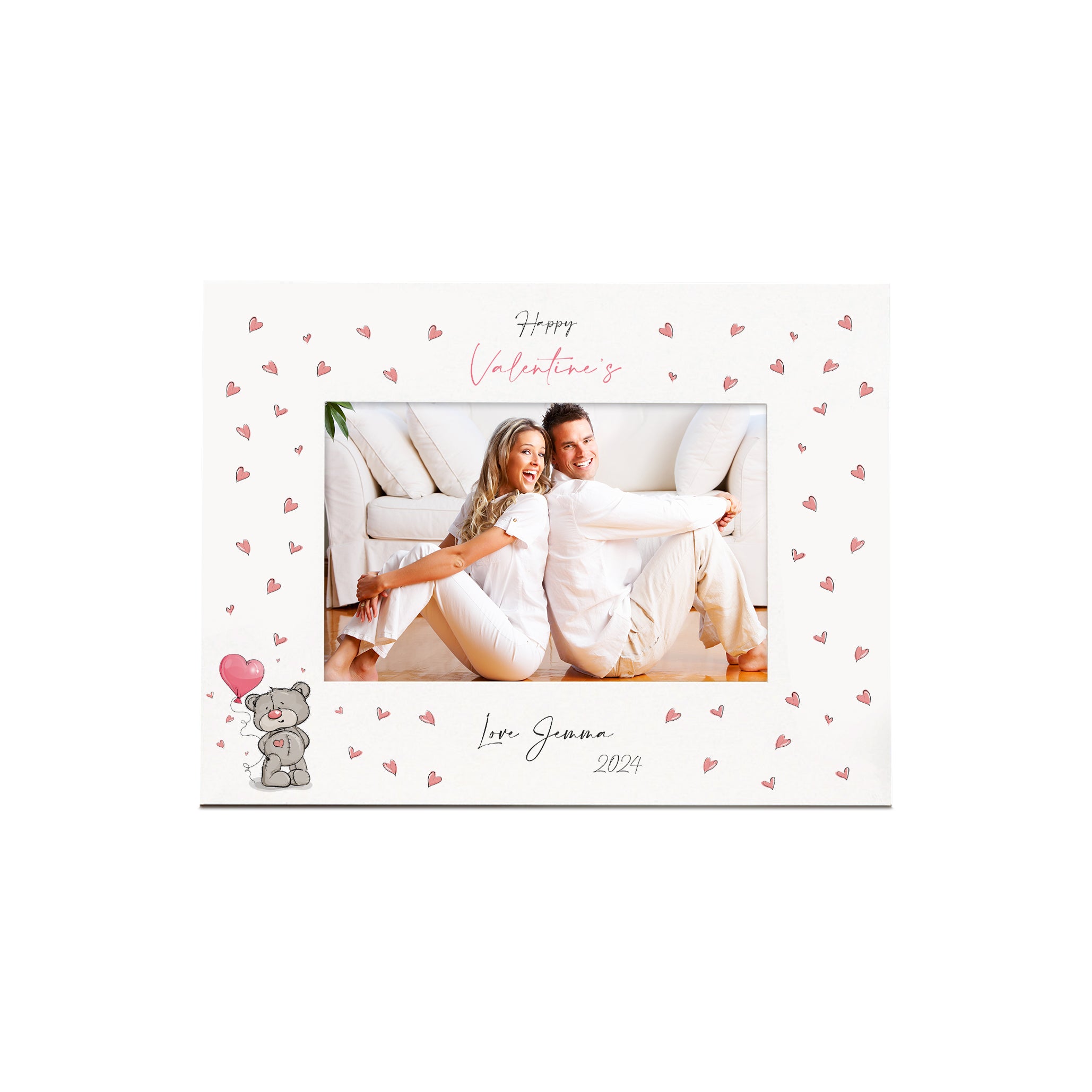 The frame has an clean white finish with the print of our first valentines on top with the love from and year below. The frame will hold one standard 6" x 4" photo. There is a stand at the rear so will sit flat on any surface, but can also be wall hung.