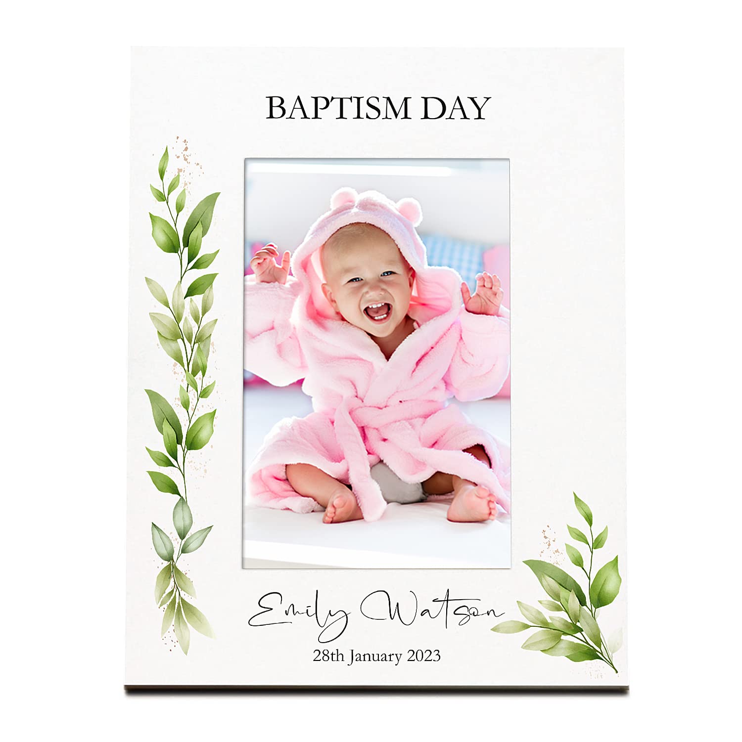 The frame has an clean white finish with the print of Baptism on top and the name and date below The frame will hold one standard 6" x 4" photo. There is a stand at the rear so will sit flat on any surface, but can also be wall hung.
