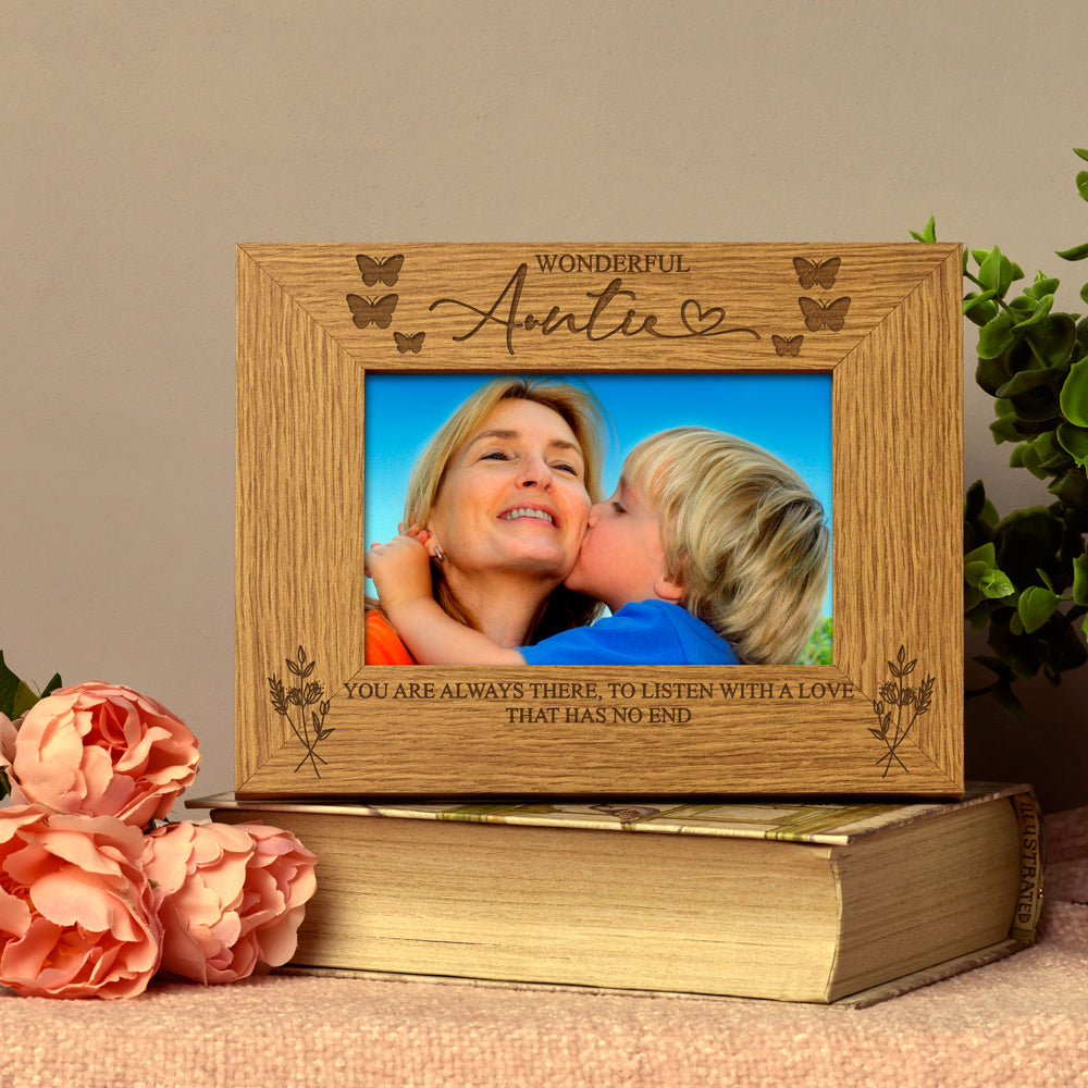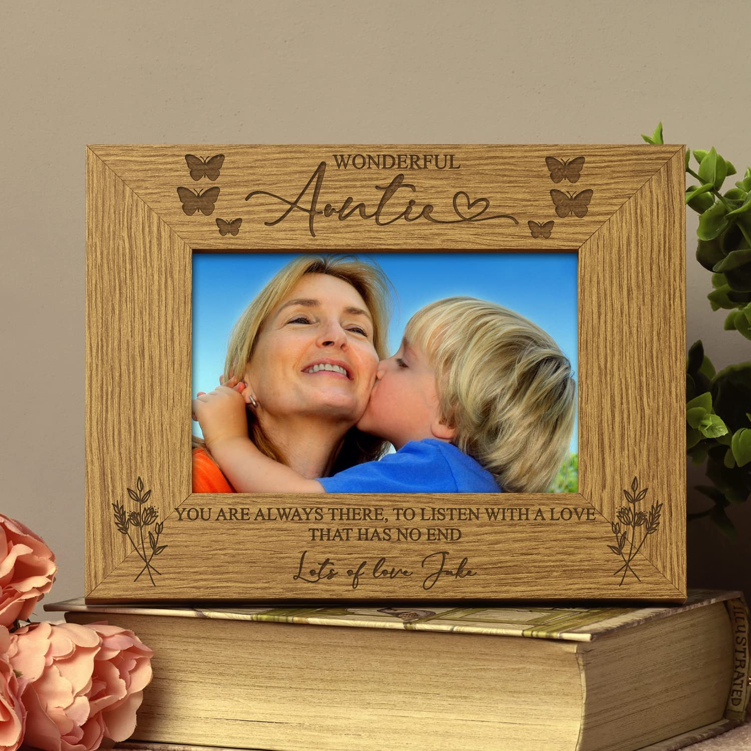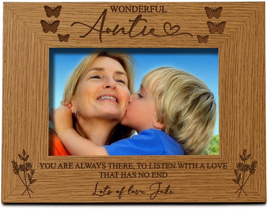 The frame has a oak wood finish with the engraving of Wonderful Auntie" on top while underneath you have "You are always there, to listen with a love that has no end" and the personalisation of your choice under that. Please select the photo frame size you require, the sizes are for the photo size. There is a stand at the rear so will sit flat on any surface.