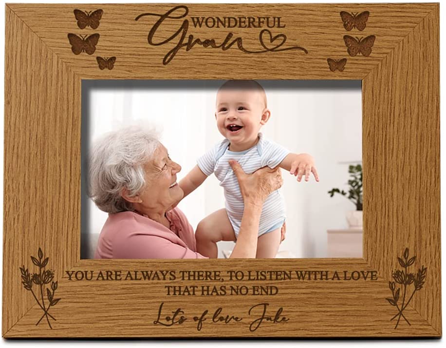 The frame has a oak wood finish with the engraving of Wonderful Gran" on top while underneath you have "You are always there, to listen with a love that has no end" and the personalisation of your choice under that. Please select the photo frame size you require, the sizes are for the photo size. There is a stand at the rear so will sit flat on any surface.