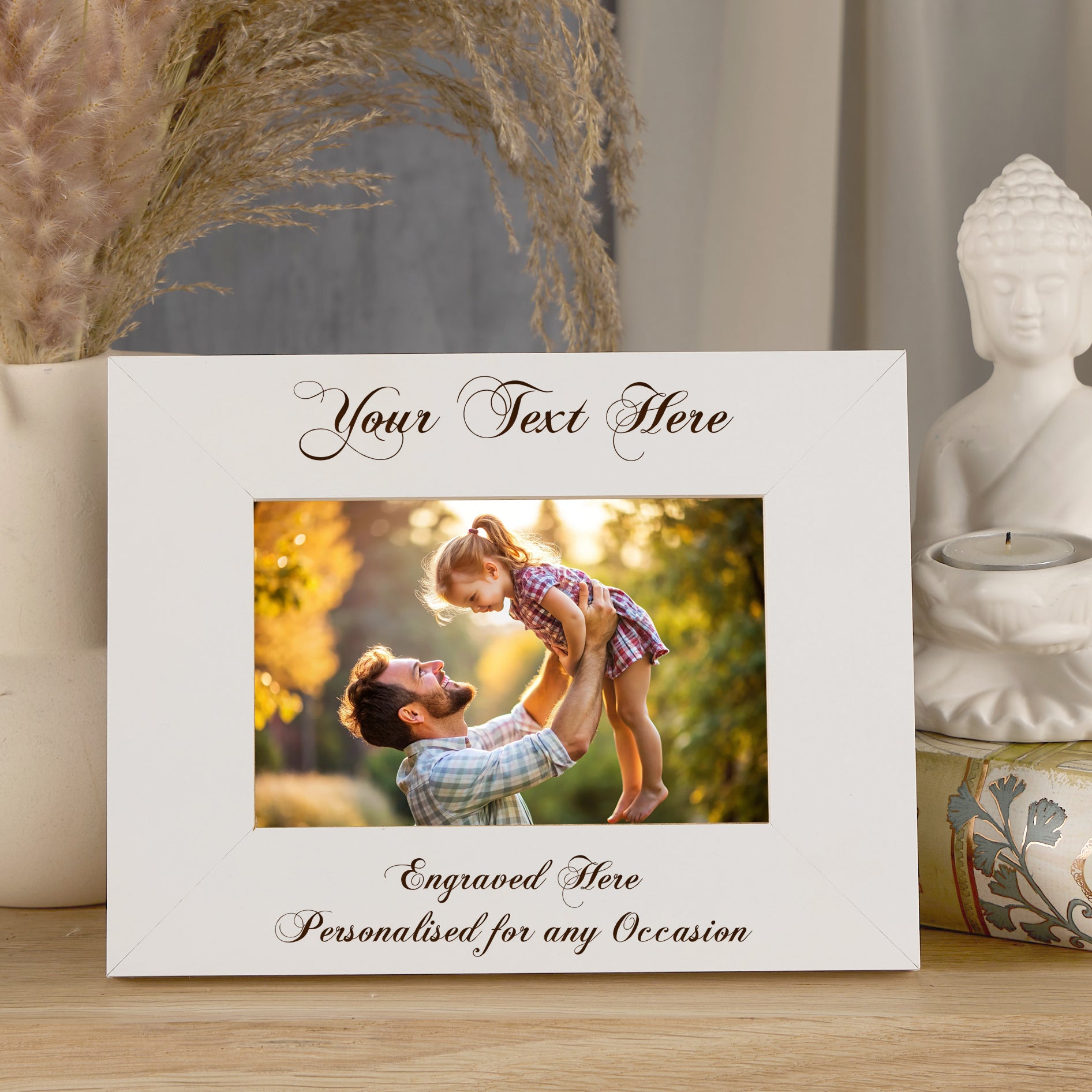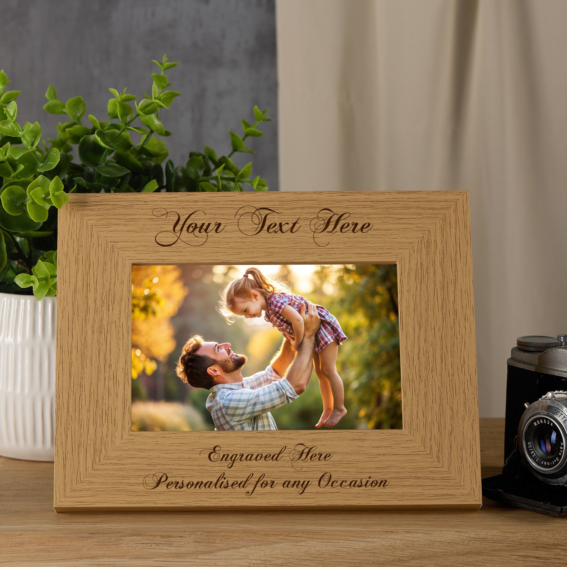 A lovely wooden frame to display that all important or memorable photo. The frame has a solid wood finish with the engraving of your choice. The photo frame will hold one standard photo. The size refers to the aperture size. There is a stand at the rear so will sit flat on any surface. The personalisation is done via a laser engraver giving a deep engraved finish..