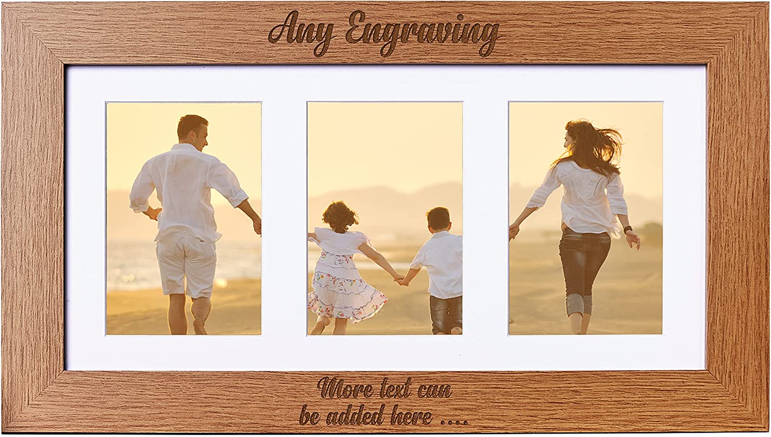 The frame has a oak wood finish with the engraving of your choice. The photo frame will hold three standard 6" x 4" photos The frame is for wall hanging as there is a hook to the rear. The personalisation is done via a laser engraver giving a deep engraved finish.. Should you forget to add a note please mail us under your order with your requirements.