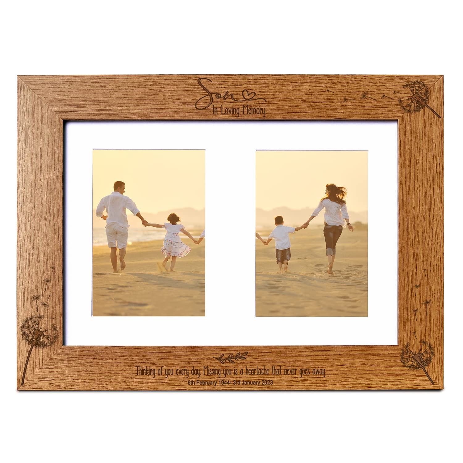 The frame has a oak wood finish with the engraving Son in loving memory on top along with a fixed sentiment and personalised dates to the bottom. The photo frame will hold two standard 6" x 4" photos The personalisation is done via a laser engraver giving a deep engraved finish..
