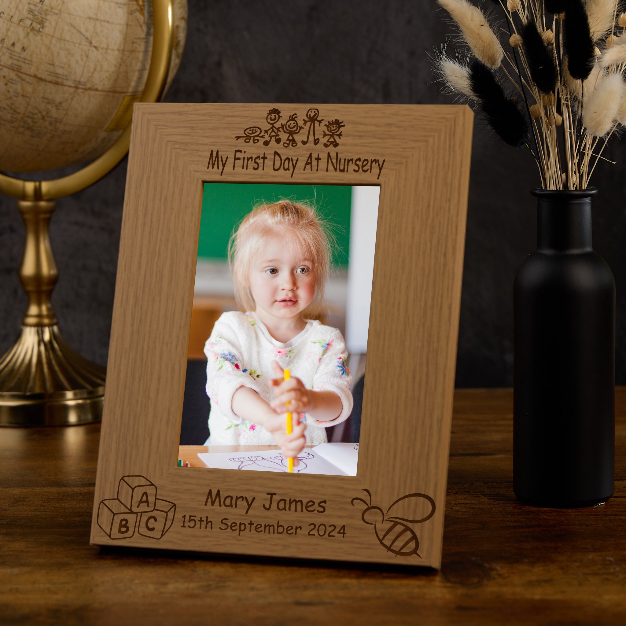 The frame has a oak wood finish with the engraving of "My First Day At Nursery" on top while underneath you have room for your own wording Please select the photo frame size you require, the sizes are for the photo size. There is a stand at the rear so will sit flat on any surface.