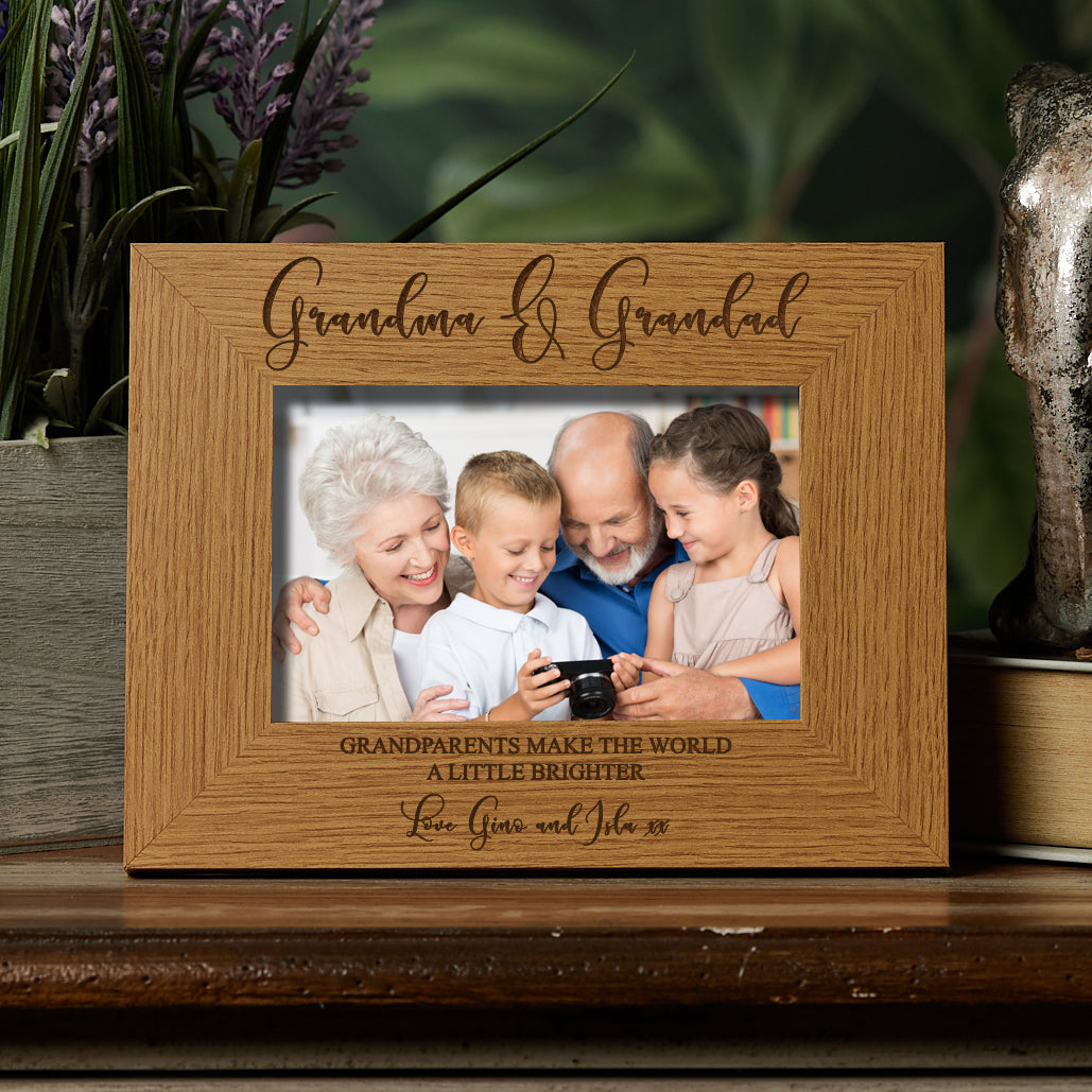 The frame has a solid wood finish with the engraving of "Grandma and Grandad "GRANDPARENTS MAKE THE WORLD A LITTLE BRIGHTER" to the bottom and your personalisation to the bottom.. Please select the photo frame size you require, the sizes are for the photo size. Can be both wall hung as well as stood flat.