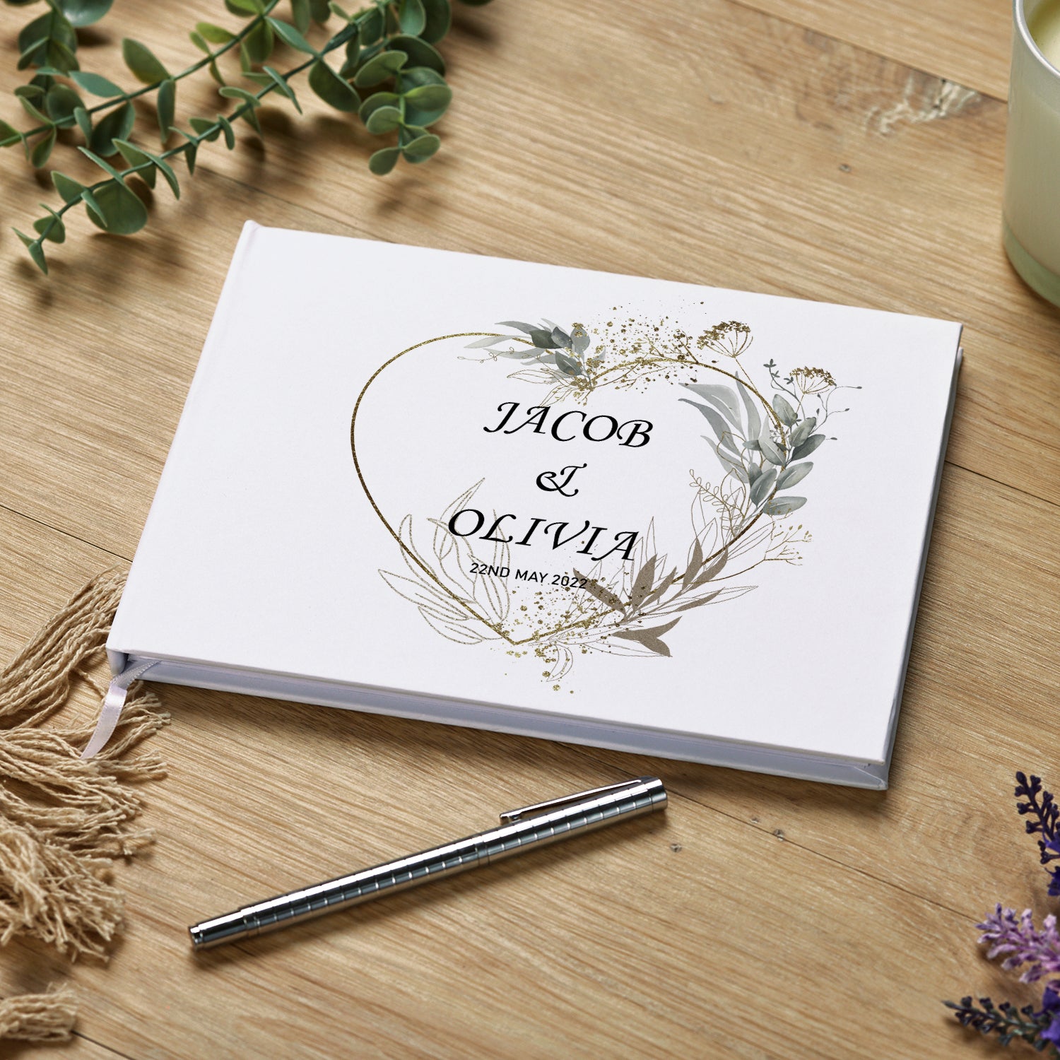 Wedding Guest Book Personalised With Green Silver Floral Heart Theme