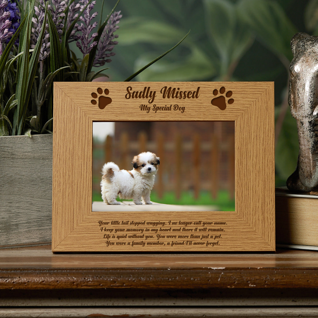 The frame has a solid wood finish with the engraving of "Sadly Missed...My special dog.." and below Your little tail stopped wagging. I no longer call your name. I keep your memory in my heart and there it will remain Life is quiet without you. You were more than just a pet. You were a family member, a friend I'll never forget" Please select the photo frame size you require, the sizes are for the photo size. There is a stand at the rear so will sit flat on any surface.