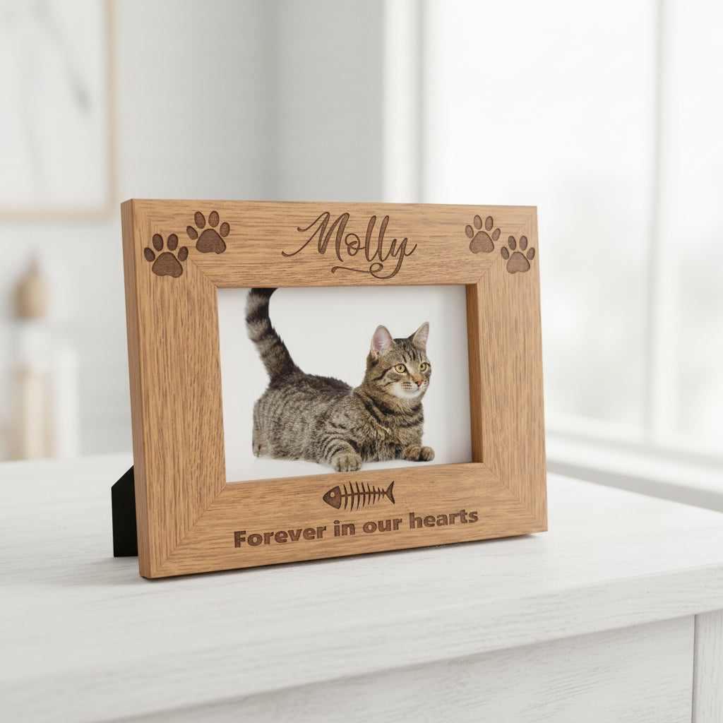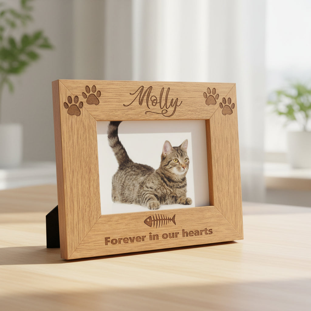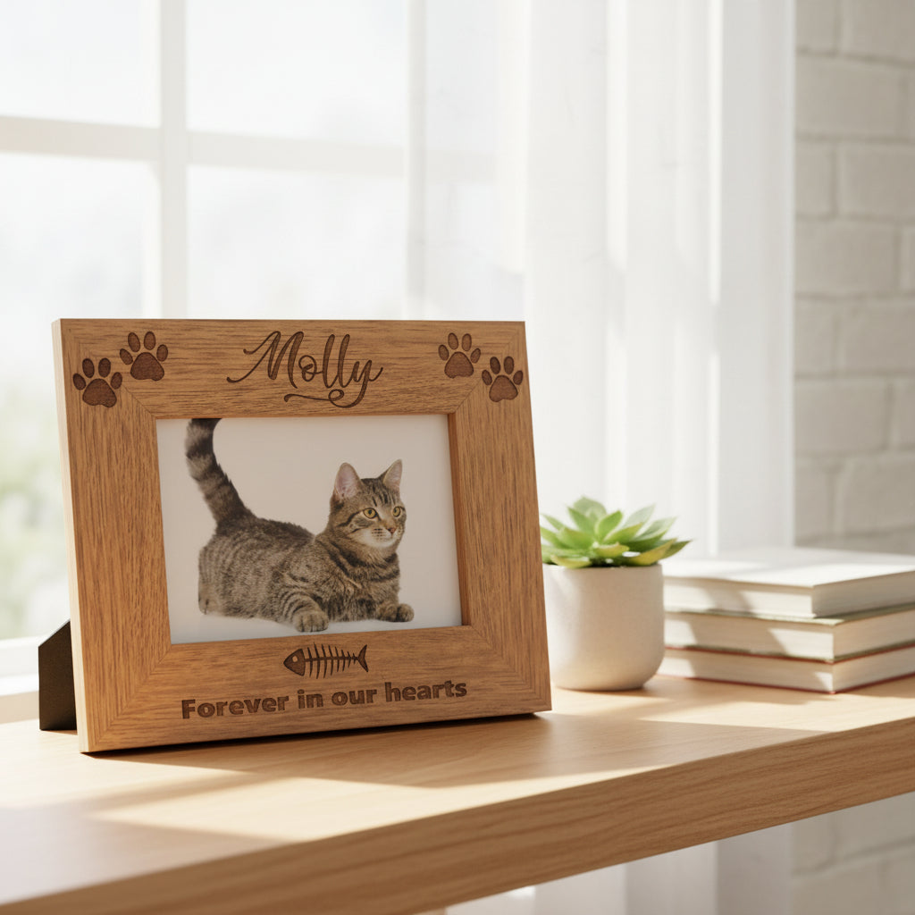 Honour the memory of a beloved feline companion with our Cat Remembrance Personalised Engraved Photo Frame Gift—a dignified tribute designed to celebrate the joy and unconditional love pets bring to our lives. This thoughtfully crafted frame provides a meaningful way to preserve and display a cherished photograph of your cat. Constructed from solid wood with a refined finish, the frame combines durability with understated elegance, ensuring it remains a treasured keepsake for years to come. Each frame is personalised with your name engraved at the top, followed by the heartfelt message "Forever In Our Hearts" beneath—creating a bespoke memorial that acknowledges the lasting impact your pet had on your family. The versatile design accommodates both wall mounting and tabletop display, allowing you to position the frame wherever feels most appropriate—whether in a living space, bedroom, or quiet corner of remembrance. Available in multiple sizes to suit your preferred photograph dimensions, the frame ensures your chosen image is showcased with appropriate prominence and protection. This engraved photo frame serves as a compassionate gift for pet owners grieving the loss of a cherished cat, or as a personal memorial to mark the passing of a beloved companion. It transforms a simple photograph into a lasting tribute that honours the special bond shared between pet and owner—a gentle reminder that their memory endures.
