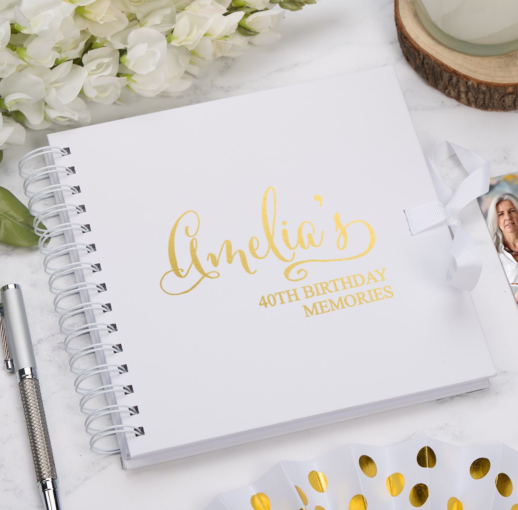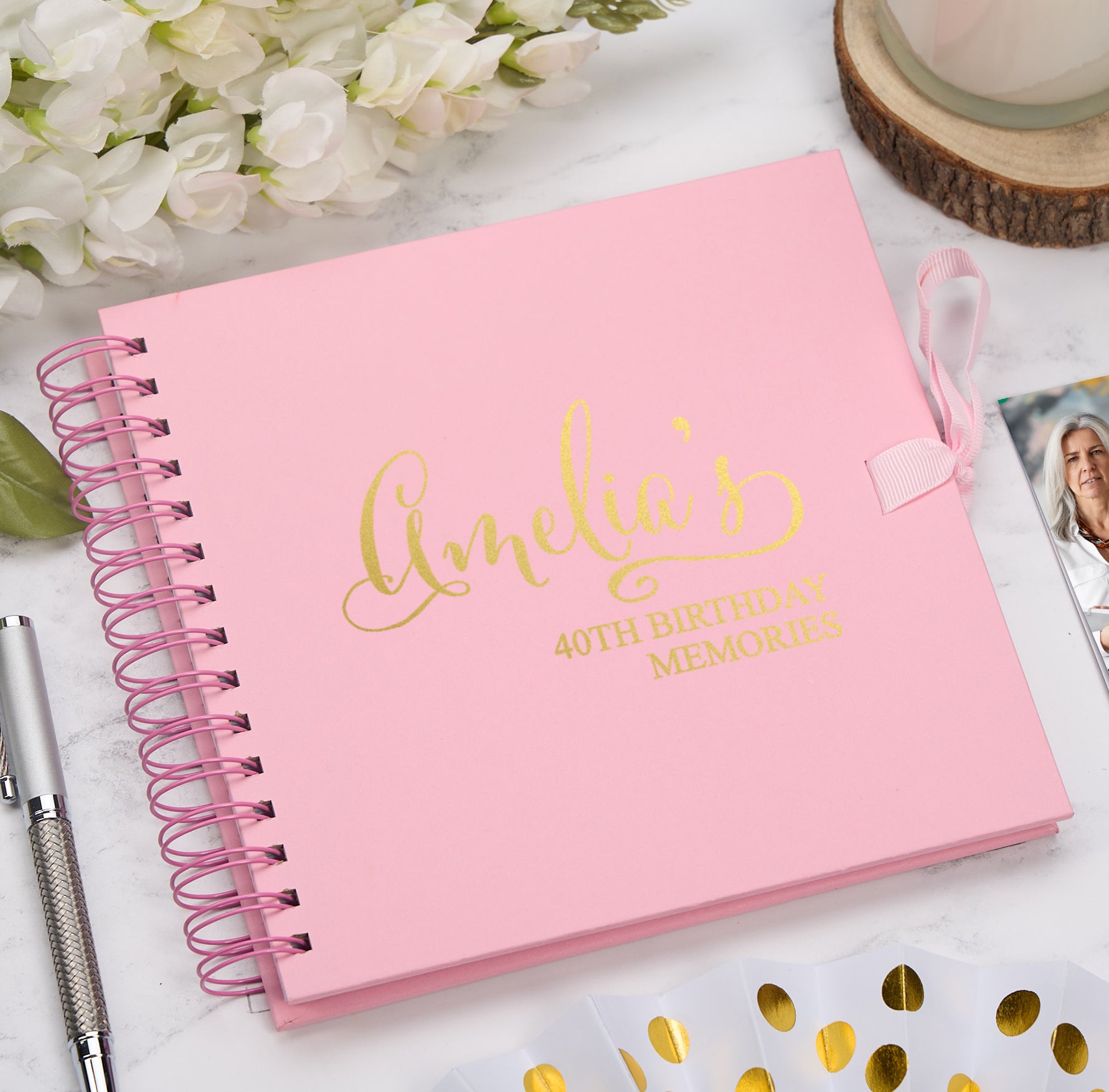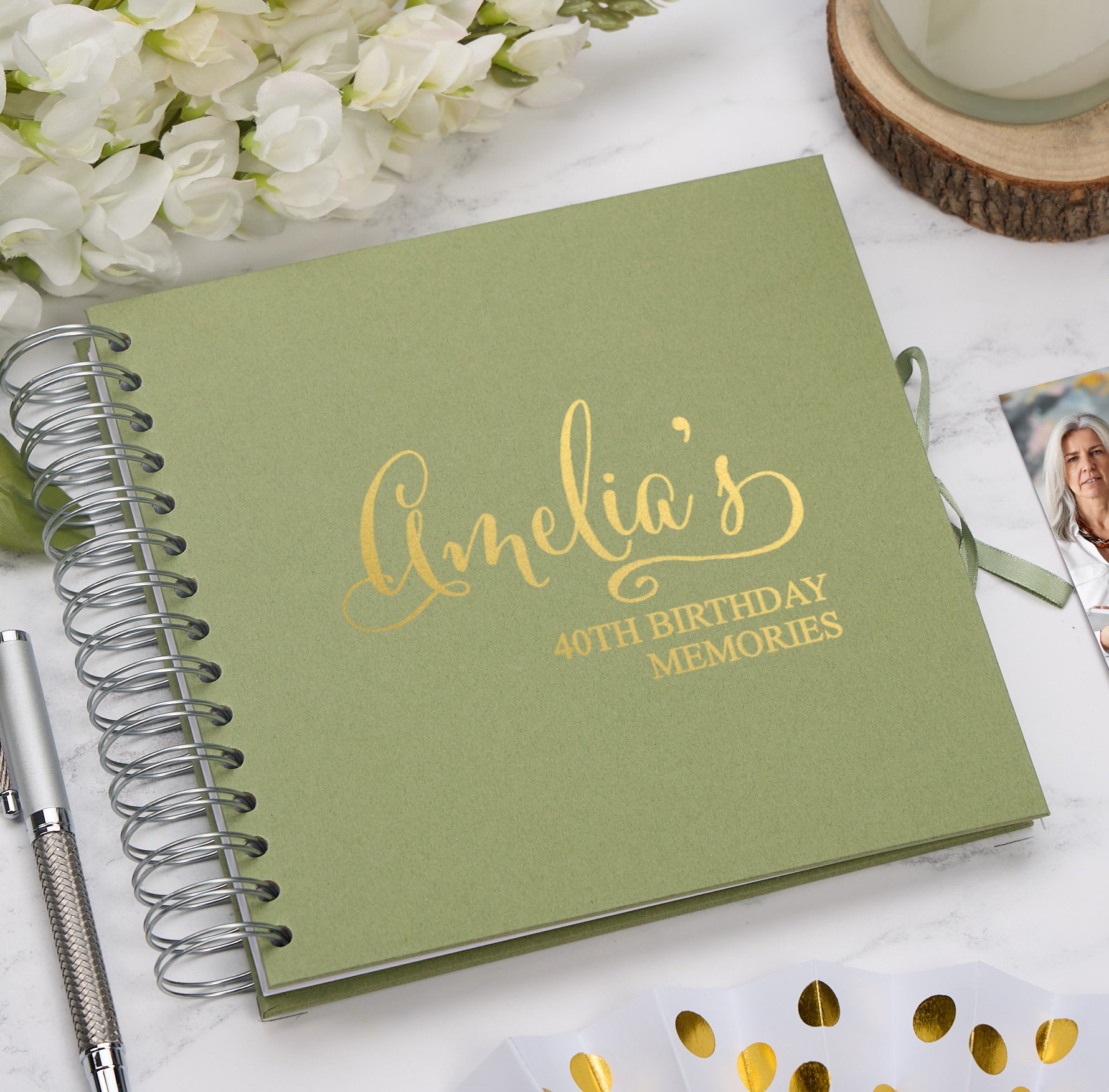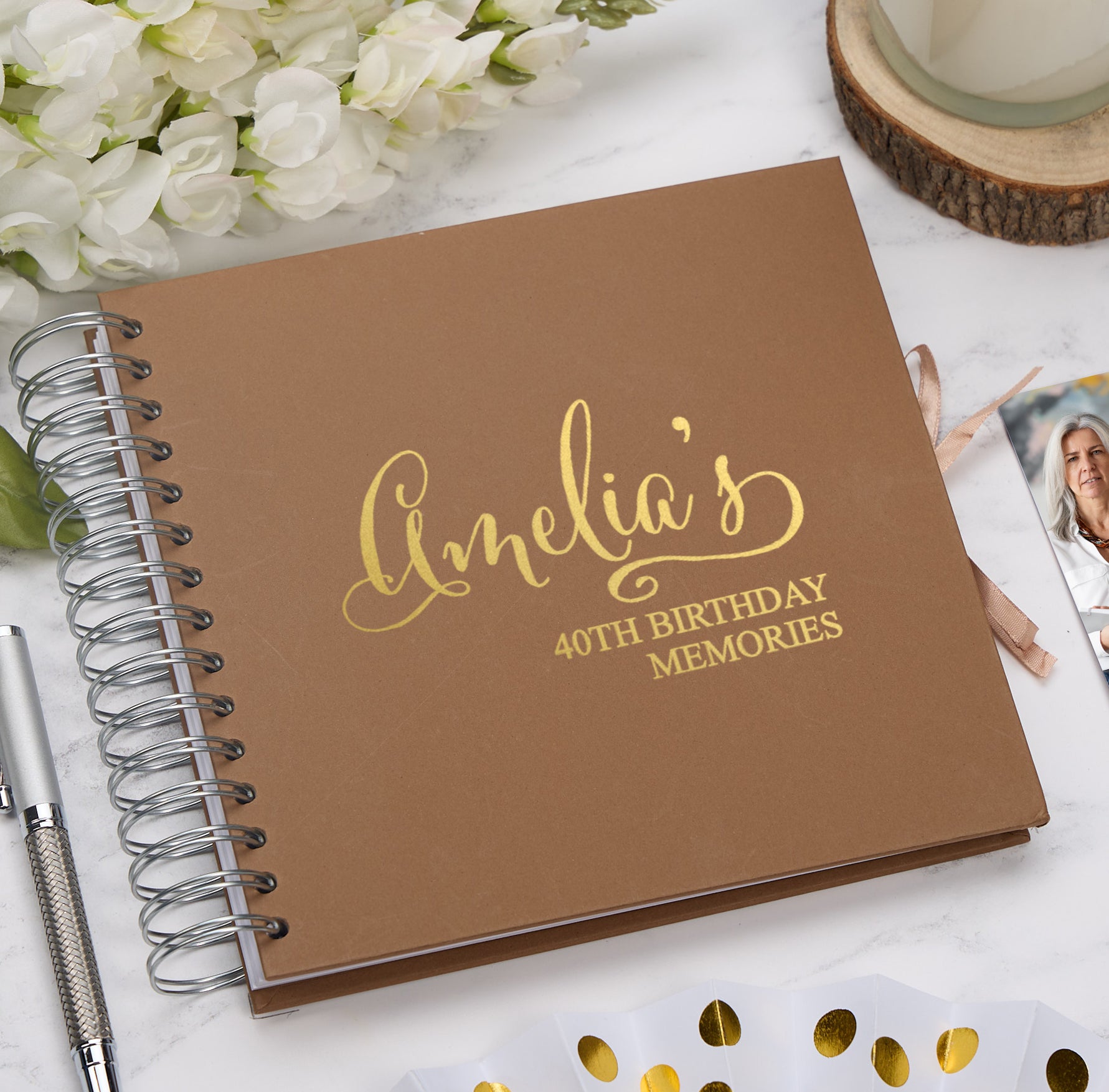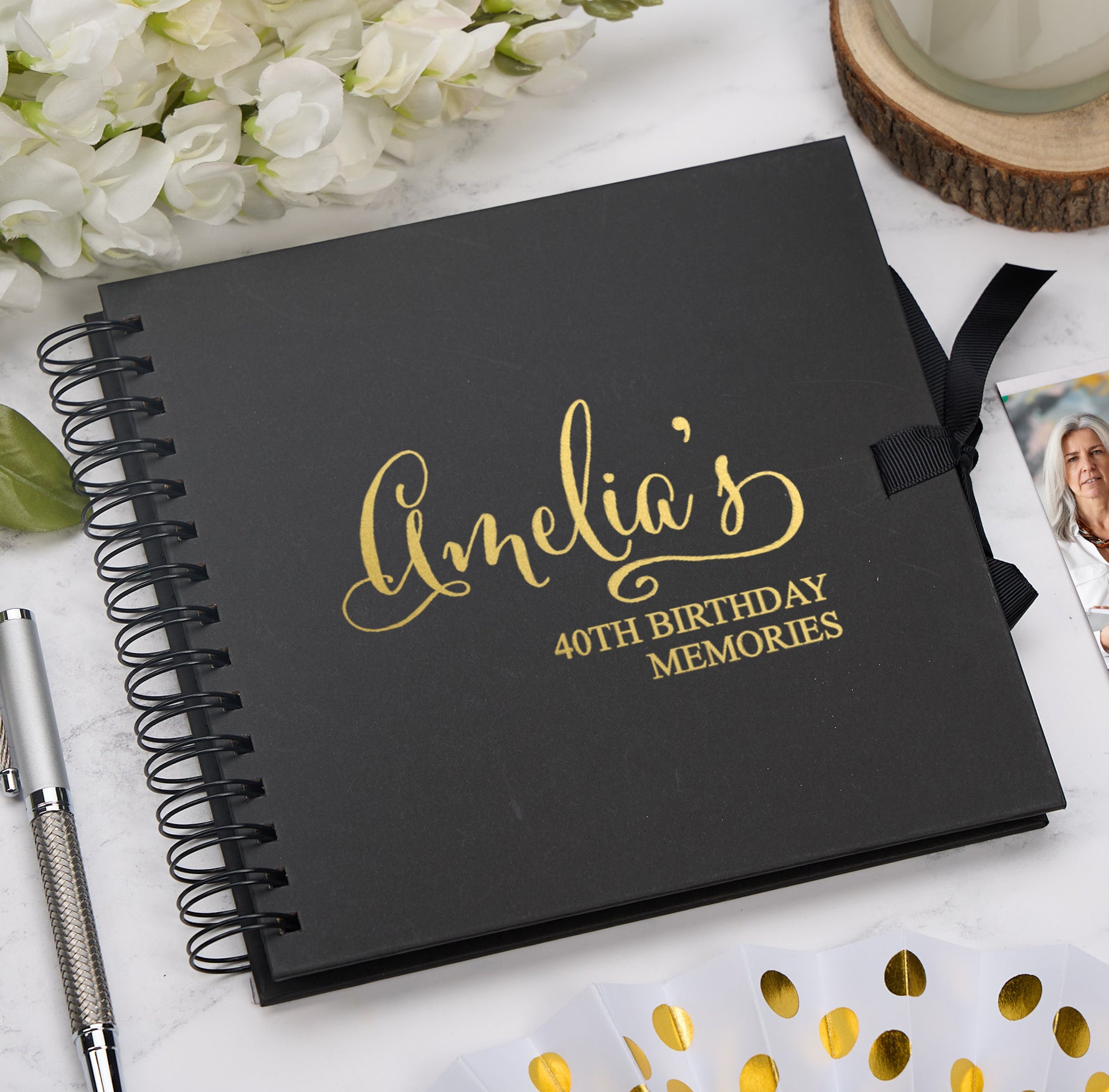 For personalisation please choose the scrapbook colour, state the foil colour and then we required the name and age. e.g. Amelia, 40th