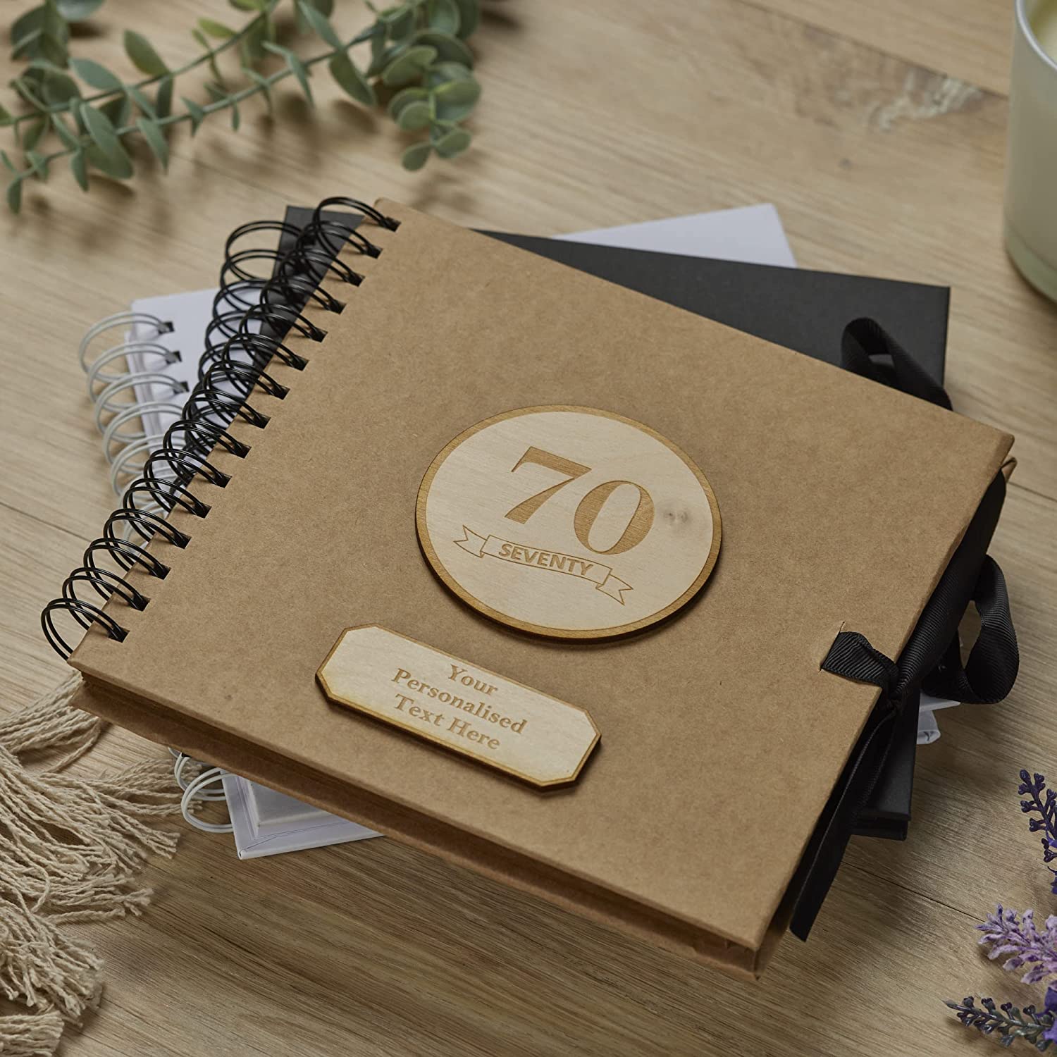 Stunning Spiral Bound Kraft Scrapbook with Wood Finish and Personalised Details for 70th Birthday. Bring the blank...