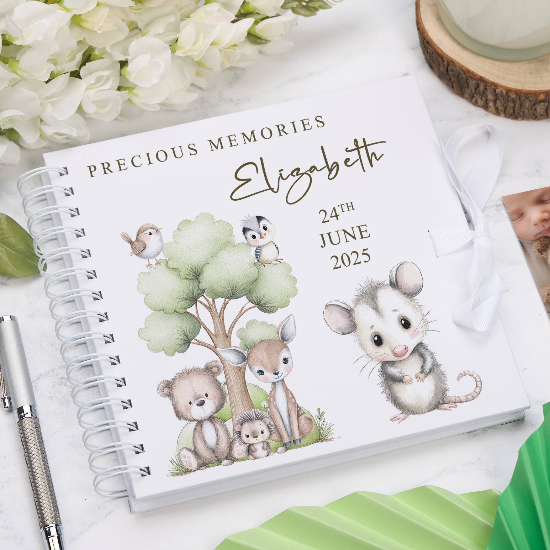 This personalised baby scrapbook features an enchanting woodland animals design, perfect for capturing and preserving your baby's special moments. The memory book includes dedicated pages to record important birth details, milestones, and keepsakes, making it a meaningful and lasting treasure. Designed with both charm and practicality, this album offers new parents a beautiful way to document their child’s early days and create a cherished family heirloom. Its thoughtful layout and high-quality presentation ensure your memories are protected and joyfully revisited for years to come.