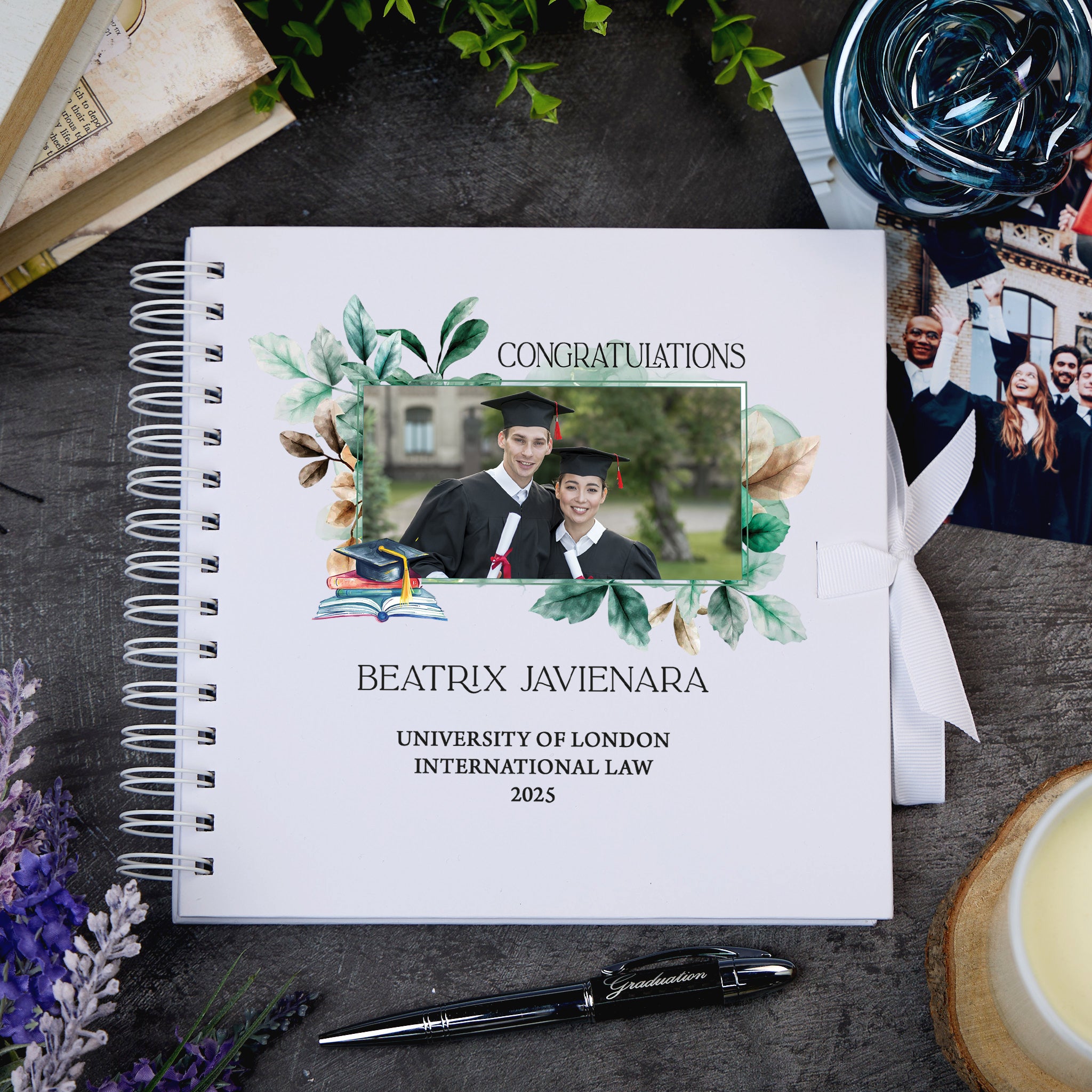 Celebrate the milestone of graduation with this personalised scrapbook, designed to preserve your most treasured memories. Custom-made to showcase your photos and keepsakes from graduation day, this album offers a thoughtful and elegant way to document your achievements. Crafted with care, it serves as a lasting keepsake that you can revisit for years to come, making it an ideal gift for graduates or a meaningful personal memento.