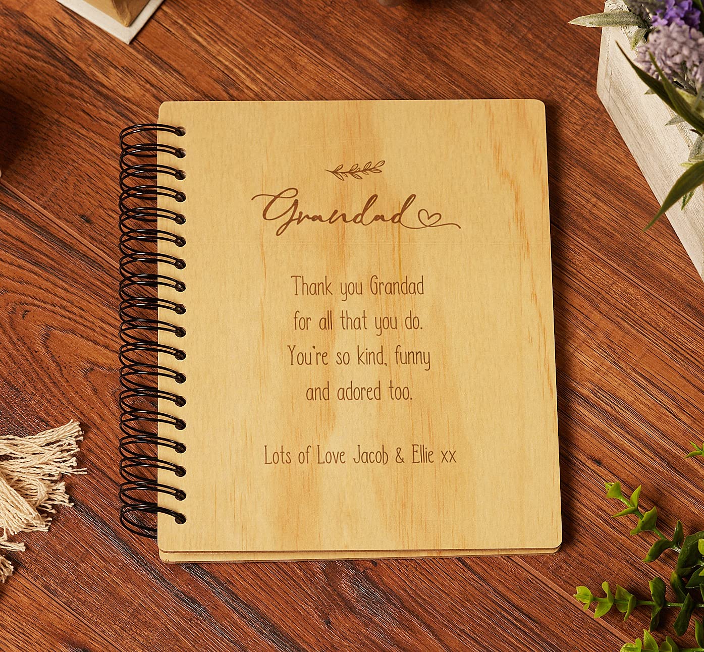 Spiral Bound We engrave into the wood of the front cover giving it a lovely detailed finish For this album we just require the personalisation under the main main sentiment. Please simply message us during checkout but should you miss it then simply message us with your requirements from your order.