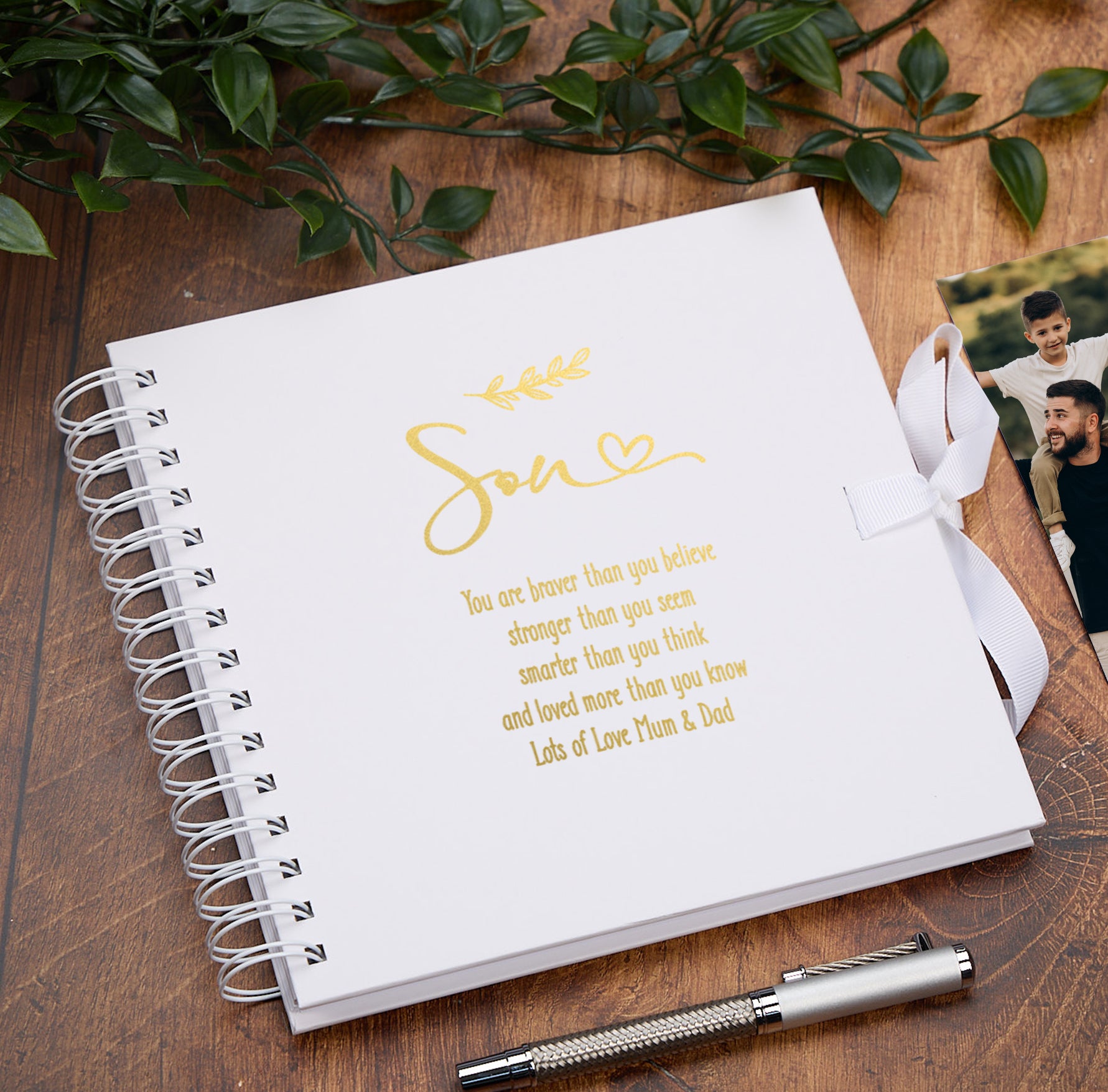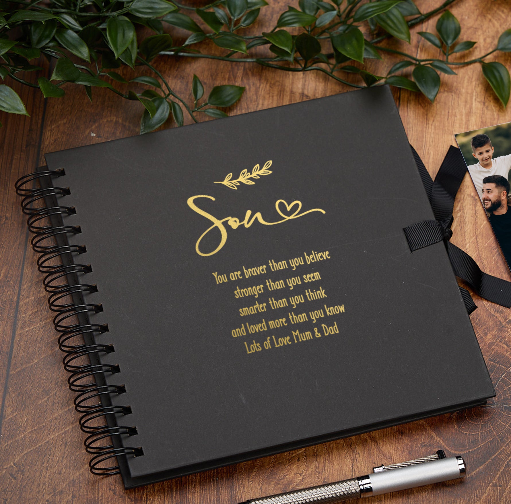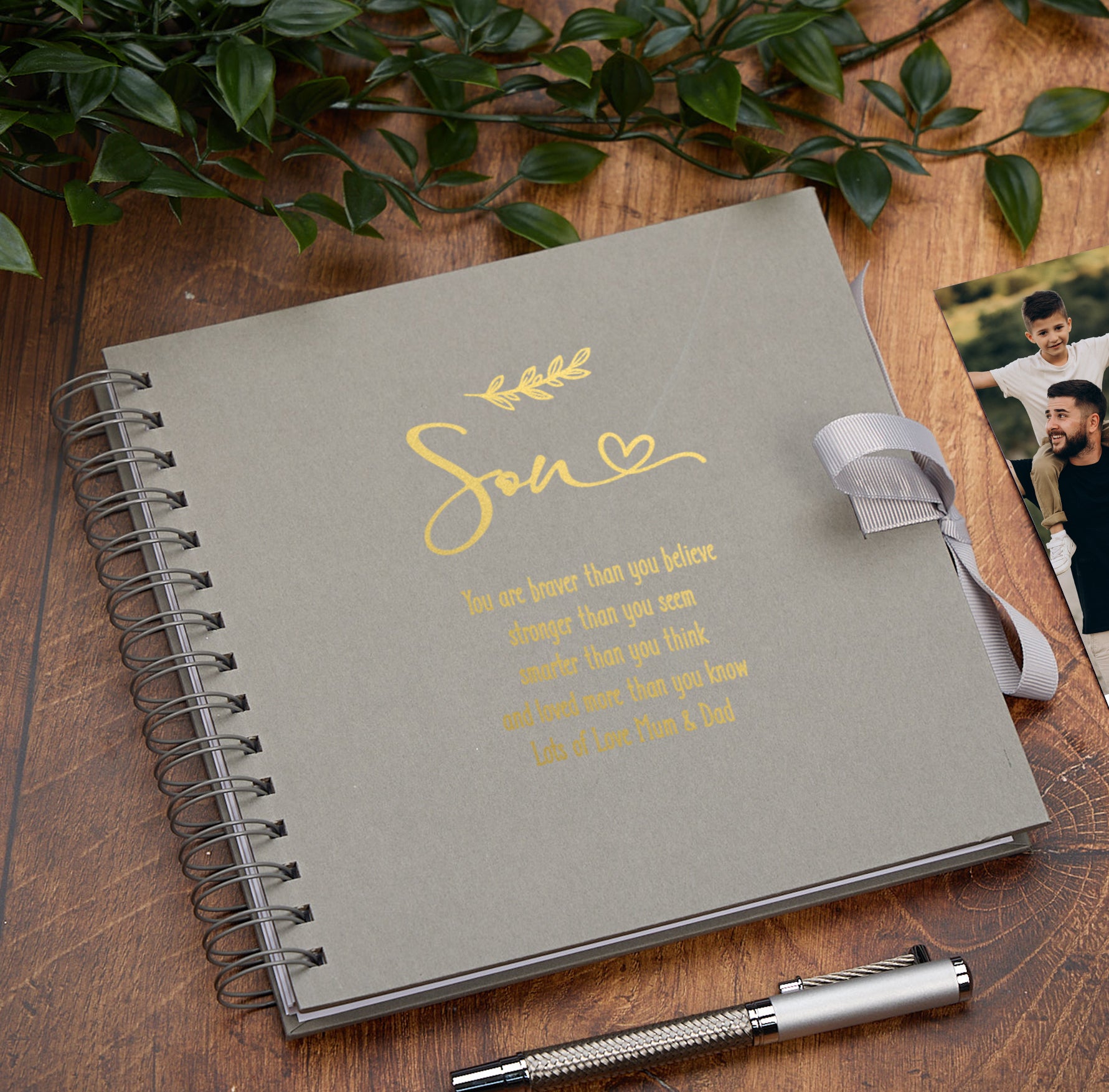 Keep one's memories immortalised in this stunning Spiral Bound Kraft Scrapbook with an eye catching Metallic Foil finish and personalised details. Bring the blank pages to life by adding a variety of papers, embellishments and cardstock to complement personal details such as photographs, cards and other memorabilia. You can stamp in dates and make annotations to the pages easily, and even create fold-out pieces and pockets if you wish!
